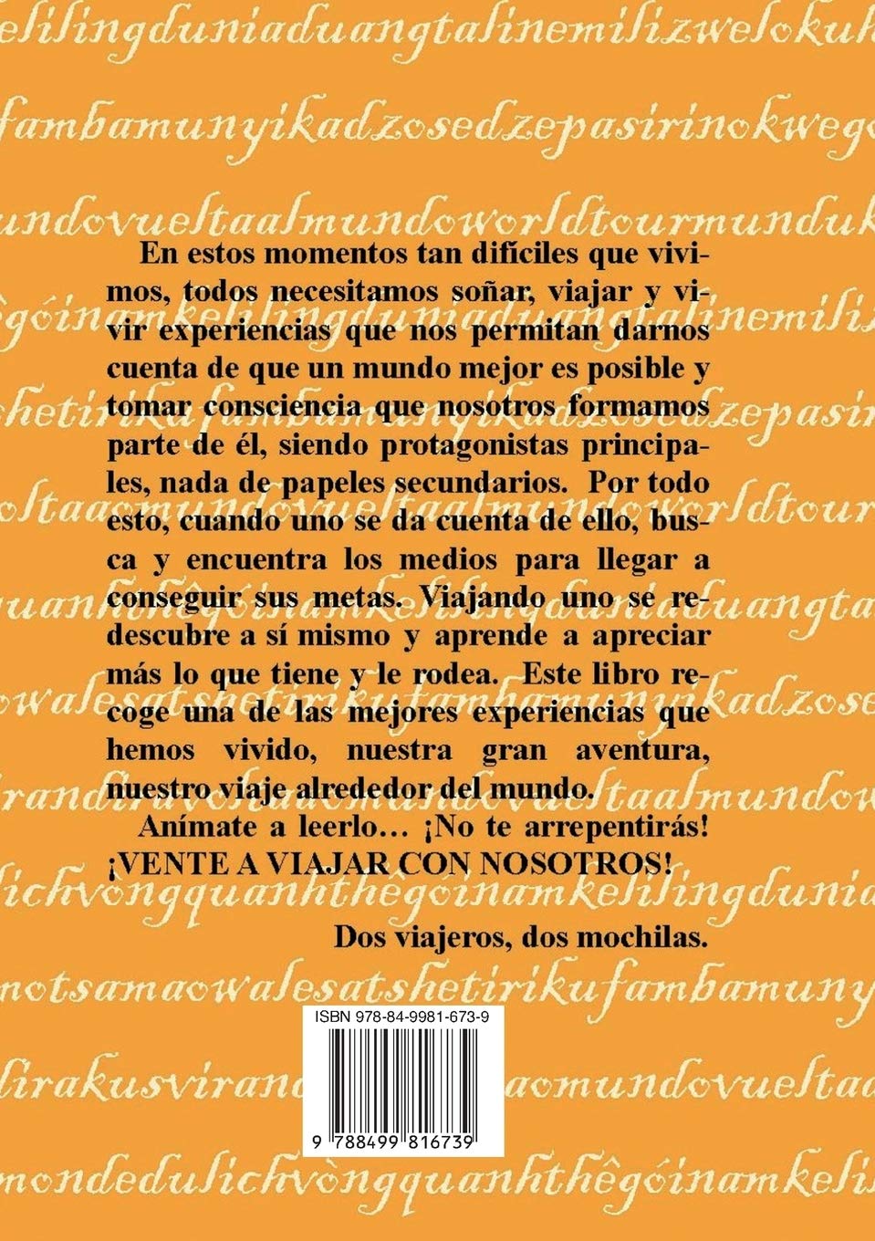 En estos momentos tan difíciles que vivimos, todos necesitamos soñar, viajar y vivir experiencias que nos permitan darnos cuenta de que un mundo mejor es posible y tomar consciencia que nosotros formamos parte de él, siendo protagonistas principales, nada de papeles secundarios. Por todo esto, cuando uno se da cuenta de ello, busca y encuentra los medios para llegar a conseguir sus metas. Viajando uno se redescubre a sí mismo y aprende a apreciar más lo que tiene y le rodea. Este libro recoge una de las mejores experiencias que hemos vivido, nuestra gran aventura, nuestro viaje alrededor del mundo. Anímate a leerlo? ¡No te arrepentirás! ¡Vente a viajar con nosotros!Dos viajeros, dos mochilas