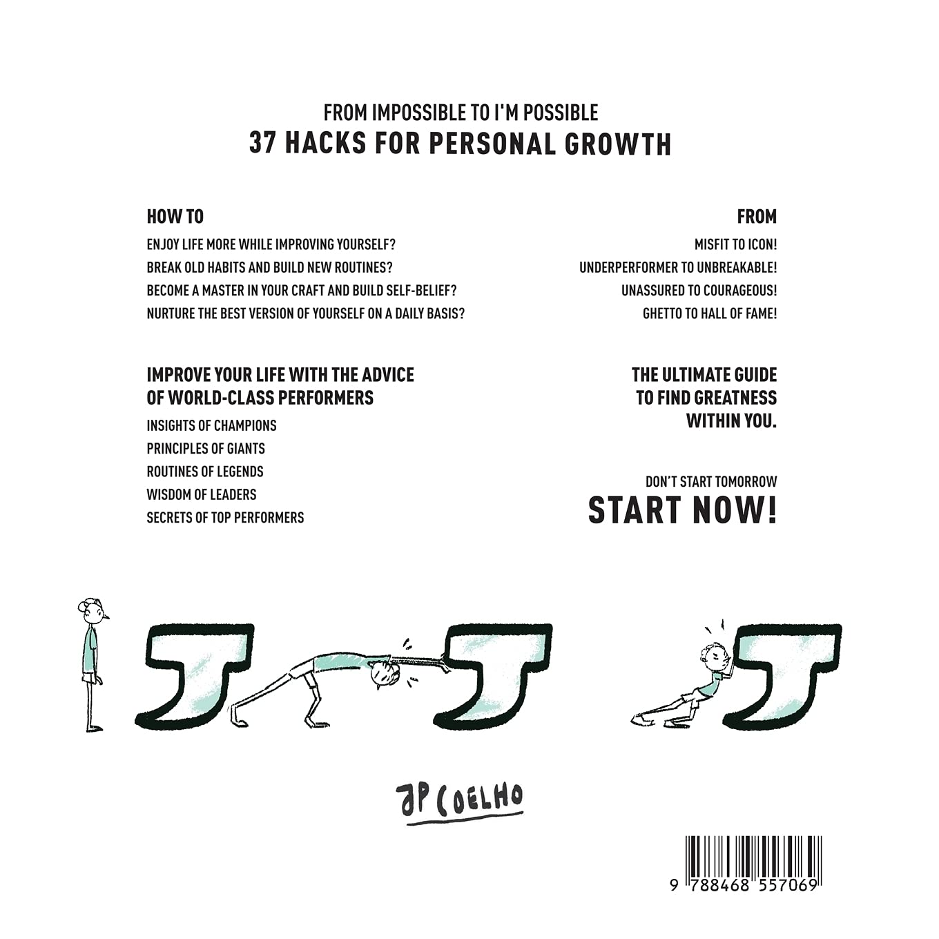 For years I would handout books to many friends – books that had an amazing effect on me personally. I gave many of these books away only todiscover later that 90% of them were NEVER ever read!Books that had the potential to change one’s life but never made it beyond page 10!That’s when I decided to take matters into my own hands.Would a compilation of all that these top achievers and gurus had written, presented in an easier way, make a book so easy and pleasant to read that, who knows, you might even read it until the very last page ?Most of the content includes topics in areas where I would love to improve myself on a daily basis.I consider the points below, mostly, as NOTES TO SELF because I want, and need, to improve in all the areas I have covered.HOW TO>>>FROMEnjoy life more while improving yourself?>>>Misfit to icon!Break old habits and build new rutines?>>>Underperformer to unbreakable!Become a master in your craft and build self-belief?>>>Unassured to courageous!Nurture the best version of yourself on a daily basis?>>>Ghetto to hall of fame!IMPROVE YOUR LIFE WITH THE ADVICEOF WORLD-CLASS PERFORMERSInsights of championsPrinciples of giantsRoutines of legendsWisdom of leadersSecrets of top performersTHE ULTIMATE GUIDE TO FIND GREATNESS WITHIN YOU.DON´T START TOMORROWSTART NOW!