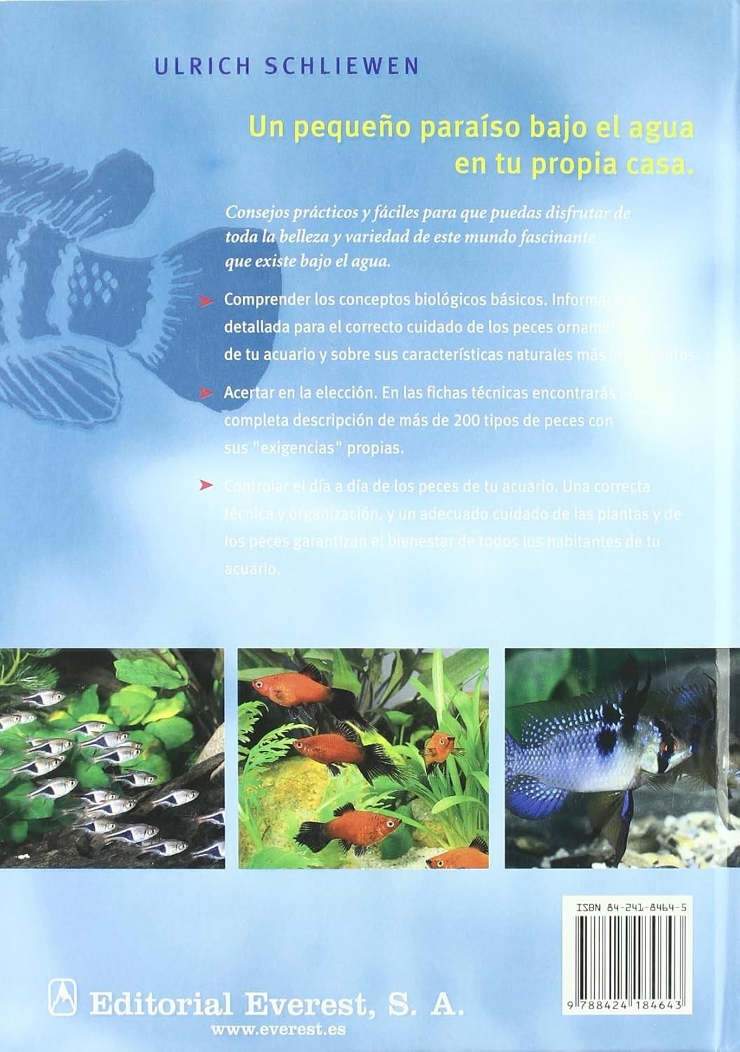 Consejos prácticos y fáciles para que puedas disfrutar de toda la belleza y variedad de este mundo fascinante que existe bajo el agua. Comprender los conceptos biológicos básicos. Información detallada para el correcto cuidado de los peces ornamentales de tu acuario y sobre sus características naturales más importantes. Acertar en la elección. En las fichas técnicas encontrarás una completa descripción de más de 200 tipos de peces con sus exigencias propias. Controlar el día a día de los peces de tu acuario. Una correcta técnica y organización, y un adecuado cuidado de las plantas y de los peces garantizan el bienestar de todos los habitantes de tu acuario.
