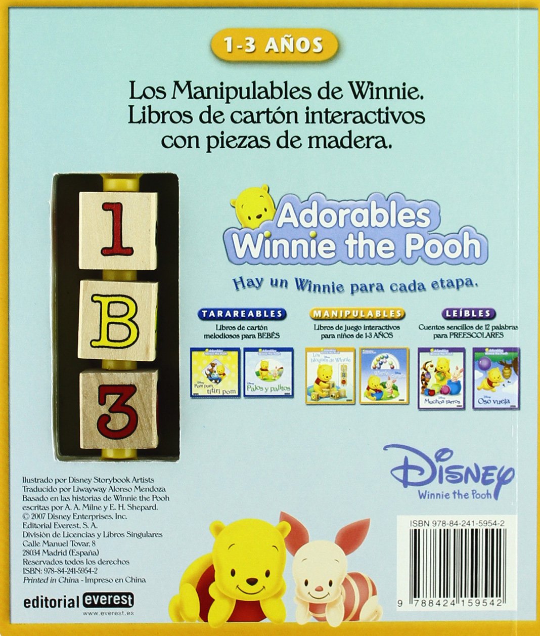 La colección Adorables Winnie the Pooh presenta libros de cartón y cartoné para los más pequeños, desde bebés hasta preescolares. Los libros de la serie Manipulables llevan juguetes interactivos pensados específicamente para niños de 1 a 3 años. Los bloques de Winnie incluye 3 bloques de madera que se giran para que los pequeños lectores puedan buscar las letras y dibujos que aparecen en el libro.