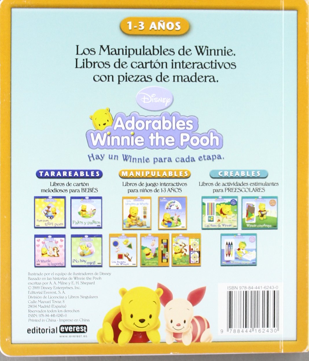 La colección Adorables Winnie the Pooh presenta libros de cartón y cartoné para los más pequeños, desde bebés hasta preescolares. Los libros de la serie Manipulables llevan juguetes interactivos pensados específicamente para niños de 1 a 3 años. Los colores de Winnie incluye dos ruedas de madera que los pequeños lectores pueden manipular para aprender a identificar los colores.
