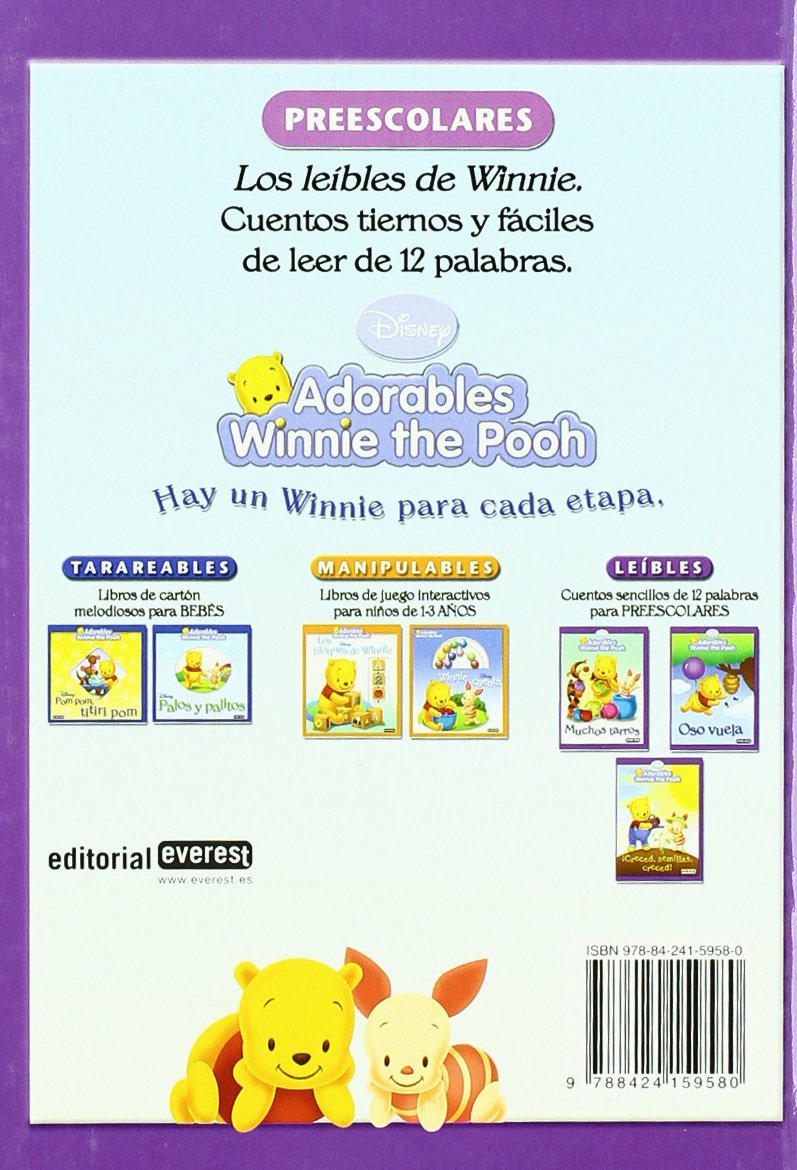 La colección Adorables Winnie the Pooh presenta libros de cartón y cartoné para los más pequeños, desde bebés hasta preescolares. Los libros de la serie Leíbles ofrecen cuentos divertidos que contienen solo 12 palabras para que el futuro lector pueda establecer una buena base de lectura, desarrollar su vocabulario a través de la repetición y las estructuras rítmicas y adquirir una lista de palabras de uso frecuente. Además los niños aparenderán a identificar palabras nuevas con sonidos y letras parecidas y se divertirán mientras aprenden a leer de forma independiente. En Oso vuela, Winnie divierte al lector con sus aventuras con las abejas.