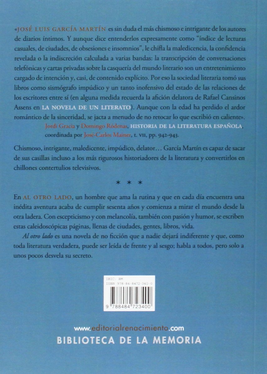 «José Luis García Martín es sin duda el más chismoso e intrigante de los autores de diarios íntimos. Y aunque dice entenderlos expresamente como ?índice de lecturas casuales, de ciudades, de obsesiones e insomnios?, le chifla la maledicencia, la confidencia revelada o la indiscreción calculada a varias bandas: la transcripción de conversaciones telefónicas y cartas privadas sobre la casquería del mundo literario son un entretenimiento cargado de intención y, casi, de contenido explícito. Por eso la sociedad literaria tomó sus libros como sismógrafo impúdico y un tanto inofensivo del estado de las relaciones de los escritores entre sí (en alguna medida recuerda la afición delatora de Rafael Cansinos Assens en La novela de un literato). Aunque con la edad ha perdido el ardor romántico de la sinceridad, se jacta a menudo de no retocar lo que escribió en caliente». Jordi Gracia y Domingo Ródenas, Historia de la literatura española, coordinada por José-Carlos Mainer, t. VII, pp. 942-943. Chismoso, intrigante, maledicente, impúdico, delator… García Martín es capaz de sacar de sus casillas incluso a los más rigurosos historiadores de la literatura y convertirlos en chillones contertulios televisivos. En Al otro lado, un hombre que ama la rutina y que en cada día encuentra una inédita aventura acaba de cumplir sesenta años y comienza a mirar el mundo desde la otra ladera. Con escepticismo y con melancolía, también con pasión y humor, se escriben estas caleidoscópicas páginas, llenas de ciudades, gentes, libros, vida. Al otro lado es una novela de no ficción que a nadie dejará indiferente y que, como toda literatura verdadera, puede ser leída de frente y al sesgo; habla a todos, pero solo a unos pocos desvela su secreto. José Luis García Martín (Aldeanueva del Camino, Cáceres, 1950) es poeta, crítico literario, profesor de la Universidad de Oviedo y director de Clarín. Revista de nueva literatura. Su obra poética, iniciada en 1972, ha sido reunida en el volumen La aventura (Renacimiento). Versiones y recreaciones de diversos poetas se recopilan en La biblioteca de Alejandría, Jardines de bolsillo y Arena y nada. Es autor de numerosos volúmenes en los que entremezcla ficción, autobiografía y literatura viajera. Destacan entre ellos Media vida, Café Arcadia, Sueño, fantasmagoría, Arco del Paraíso, dedicado a la ciudad de Venecia, Lecturas y lugares y Enigmas con jardín. Su labor crítica se ha centrado fundamentalmente en el estudio de la poesía española contemporánea, a la que ha dedicado numerosas antologías, y en la «crítica militante», desarrollada a lo largo de treinta años en diversos suplementos literarios y recopilada en libros como La poesía figurativa, Biblioteca circulante, Gabinete de lectura o el recientemente aparecido Lecturas buenas y malas (Renacimiento). Ha dedicado además diversas publicaciones a Fernando Pessoa, desde un inicial estudio-antología, de 1983, hasta la selección de Aforismos publicada en esta misma editorial. Días de 1989, publicado ese mismo año, constituye la primera entrega de su diario, del que ya han aparecido más de una docena de tomos. Los títulos más recientes son Para entregar en mano y Línea roja.