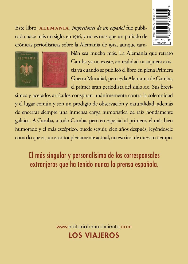 Este libro, Alemania, impresiones de un español fue publicado hace más un siglo, en 1916, y no es más que un puñado de crónicas periodísticas sobre la Alemania de 1912, aunque también sea mucho más. La Alemania que retrató Camba ya no existe, en realidad ni siquiera existía ya cuando se publicó el libro en plena Primera Guerra Mundial, pero es la Alemania de Camba, el primer gran periodista del siglo xx. Sus brevísimos y acerados artículos conspiran unánimemente contra la solemnidad y el lugar común y son un prodigio de observación y naturalidad, además de encerrar siempre una inmensa carga humorística de raíz hondamente galaica. A Camba, a todo Camba, pero en especial al primero, el más bien humorado y el más escéptico, puede seguir, cien años después, leyéndosele como lo que es, un escritor plenamente actual, un escritor de nuestro tiempo. El más singular y personalísimo de los corresponsales extranjeros que ha tenido nunca la prensa española. Julio Camba Andreu (Vilanova de Arousa, 1884-Madrid, 1962) fue durante la segunda y tercera década del siglo XX uno de los más singulares corresponsales extranjeros que haya tenido nunca la prensa española. Su maestría no ha dejado de ser elogiada por escritores tan distintos y variados como Miguel Delibes, Francisco Umbral, Cándido, Manuel Vicent o Antonio Muñoz Molina. A los dieciséis años se escapó de casa y llegó hasta Buenos Aires. Allí se introdujo en los círculos anarquistas y redactó incendiarias proclamas y panfletos. Al final fue deportado del país junto con otros anarquistas. De regreso a España empezó a colaborar en la prensa local gallega y en publicaciones revolucionarias del Madrid de comienzos de siglo, y su prosa no tardó en ocupar las columnas de los más importantes periódicos (El País, España Nueva, La Correspondencia de España, El Mundo, La Tribuna, ABC, El Sol, Ahora…). De sus quince libros publicados, siete son crónicas de viaje para diversos periódicos: Playas, ciudades y montañas (Galicia, París y Suiza), Londres, Alemania (los tres de 1916), Un año en el otro mundo (1917) (Nueva York), La rana viajera (1920) (España), Aventuras de una peseta (1923) (Alemania, Londres, Italia y Portugal) y La ciudad automática (1932) (Nueva York de nuevo). Esta edición se presenta con un prólogo de Francisco Fuster y en ella se recogen las crónicas publicadas originalmente entre mayo de 1912 y enero de 1913 en La Tribuna, y, a partir de esta fecha y hasta marzo de 1915 en ABC.