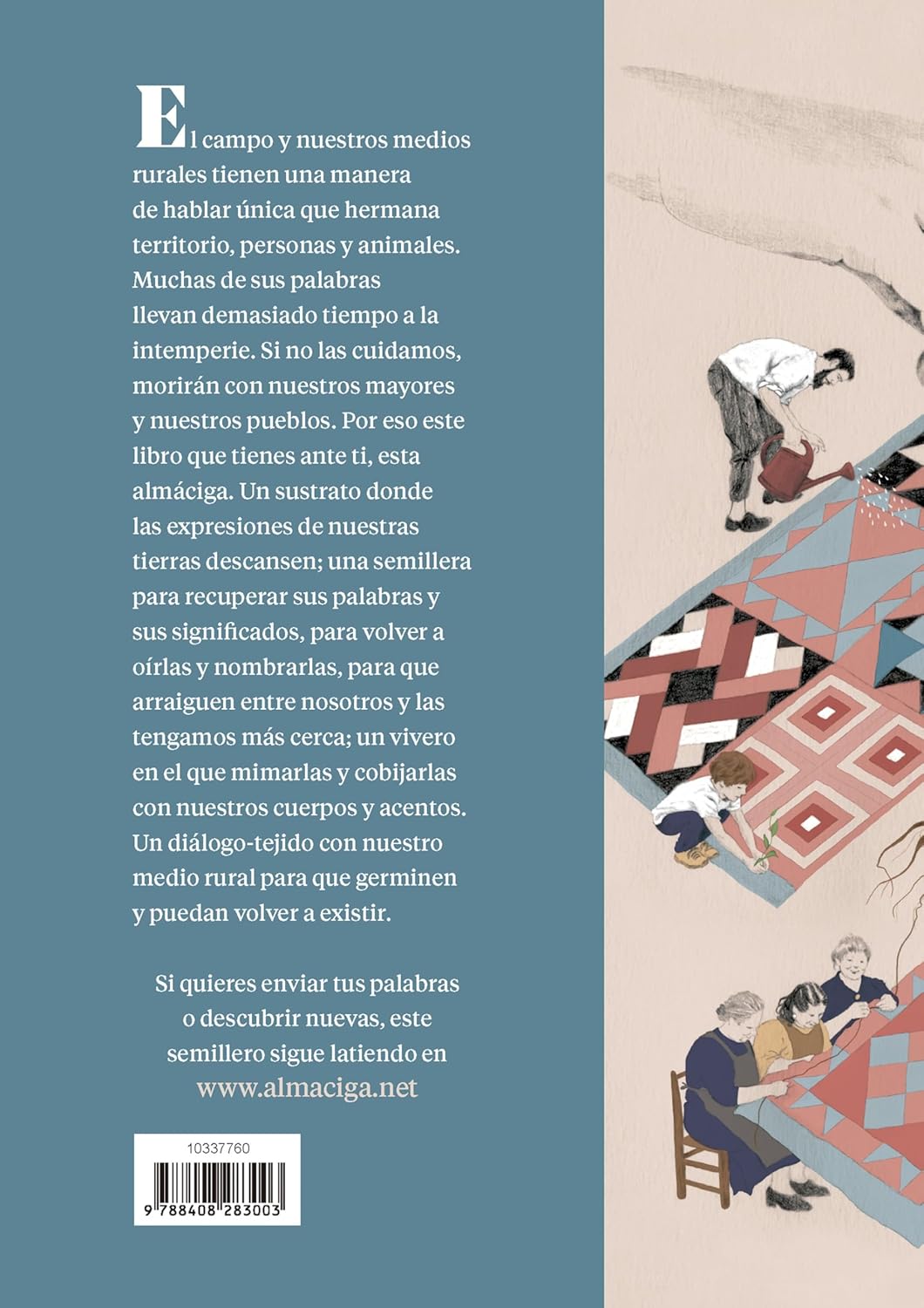 Un glosario poético ilustrado que recoge palabras del medio rural en riesgo de desaparecer.María Sánchez se ha convertido en una de las voces más reconocidas en la defensa del mundo rural y en la dignificación de su cultura. De ese afán nació Almáciga, un proyecto colaborativo en el que ha ido recogiendo palabras asociadas al campo para que no caigan en el olvido. La recolección ve la luz ahora en forma de libro, un glosario poético que huele a tierra arada y a lumbre, iluminado con las bellas ilustraciones de Cristina Jiménez. «El campo y nuestros medios rurales tienen una manera de hablar única que hermana territorio, personas y animales. Muchas de sus palabras llevan demasiado tiempo a la intemperie. Si no las cuidamos, morirán con nuestros mayores y nuestros pueblos. Por eso este libro, esta almáciga. Un sustrato donde las expresiones de nuestras tierras descansen; una semillera para recuperar sus palabras y sus significados, para volver a oírlas y nombrarlas, para que arraiguen entre nosotros y las tengamos más cerca; un vivero en el que mimarlas y cobijarlas con nuestros cuerpos y acentos. Un diálogo-tejido con nuestro medio rural para que germinen y puedan volver a existir.»