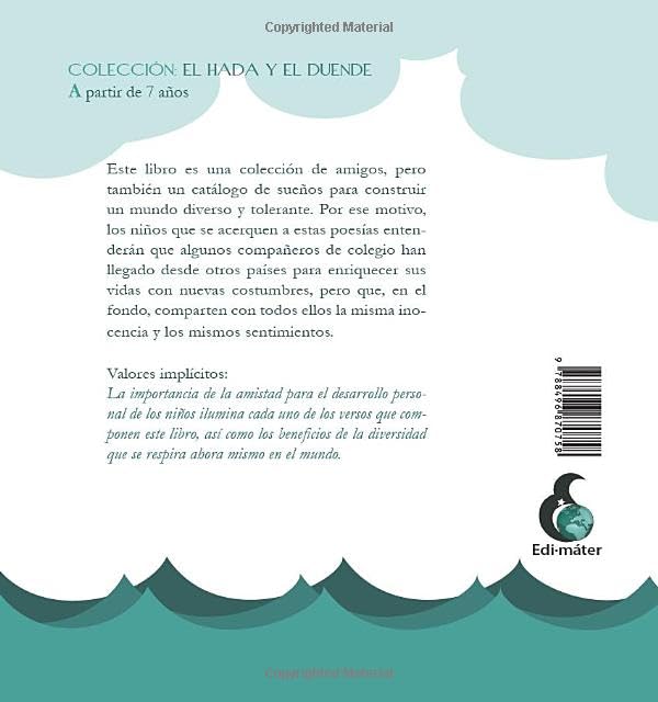 Pequeño álbum de rimas. A partir de 7 años Este libro es una colección de amigos, pero también un catálogo de sueños para construir un mundo diverso y tolerante. Por ese motivo, los niños que se acerquen a estas poesías entenderán que algunos compañeros de colegio han llegado desde otros países para enriquecer sus vidas con nuevas costumbres, pero que, en el fondo, comparten con todos ellos la misma inocencia y los mismos sentimientos. VALORES IMPLÍCITOS La importancia de la amistad para el desarrollo personal de los niños ilumina cada uno de los versos que componen este libro, así como los beneficios de la diversidad que se respira ahora mismo en el mundo. Aspectos destacables Edición muy cuidada en la que cabe resaltar las sugerentes ilustraciones realizadas a mano y ordenador con incorporación de texturas. El resultado es una pequeña joya llena de imágenes preciosas, teñidas de poesía.