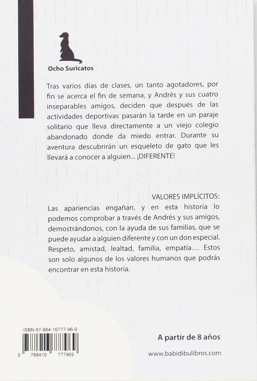 Libro de aventuras, en las que se aúnan el misterio, la música, la amistad, el respeto, la lealtad y la familia.Tras varios días de clases, un tanto agotadores, por fin se acerca el fin de semana, y Andrés y sus cuatro inseparables amigos, deciden que después de las actividades deportivas pasarán la tarde en un paraje solitario que lleva directamente a un viejo colegio abandonado donde da miedo entrar. Durante su aventura descubrirán un esqueleto de gato que les llevará a conocer a alguien… ¡DIFERENTE! Esta es una historia de aventuras, intriga, suspense y sobre todo, de amistad, compañerismo, respeto y lealtad.