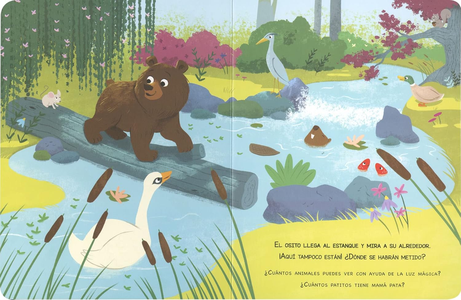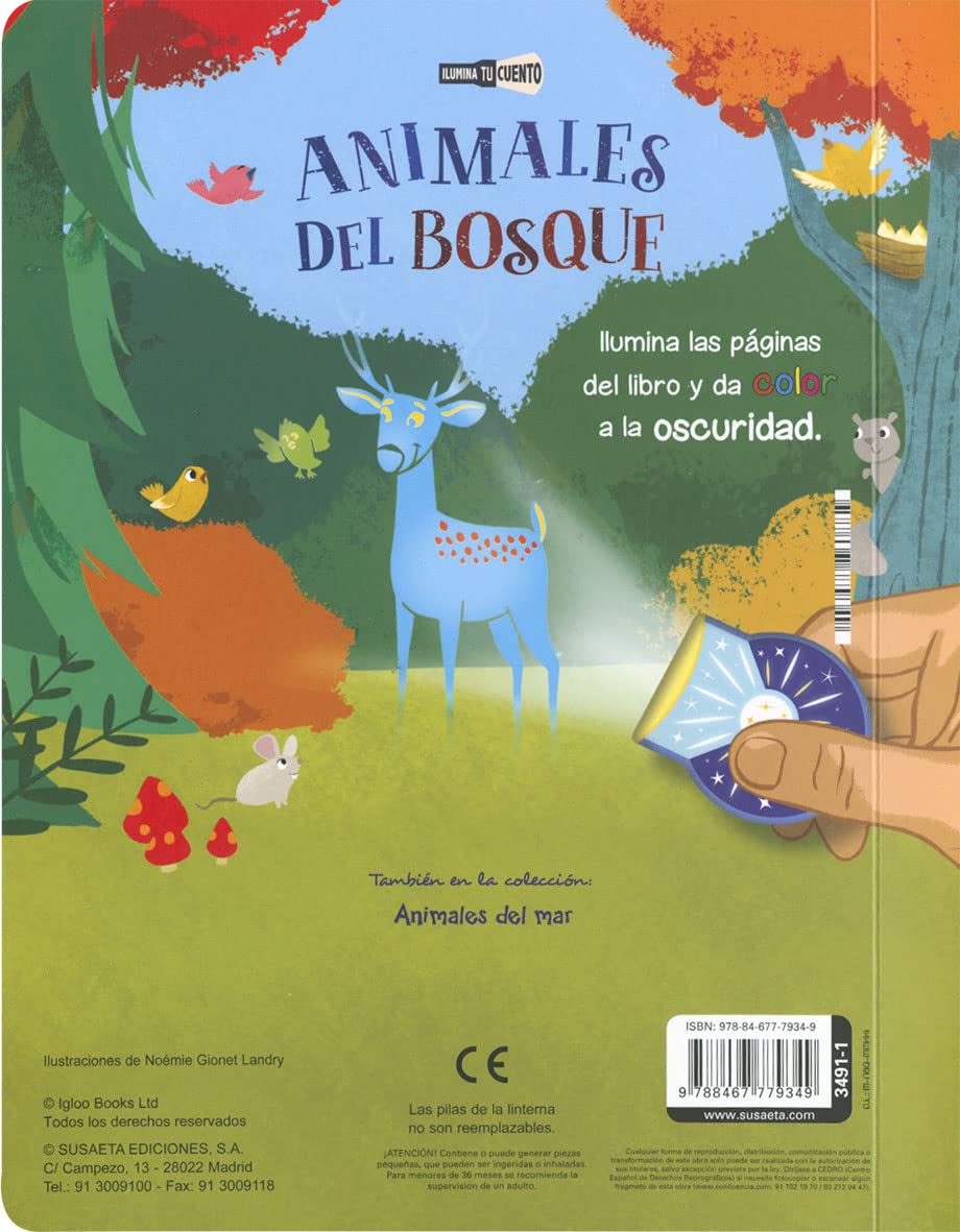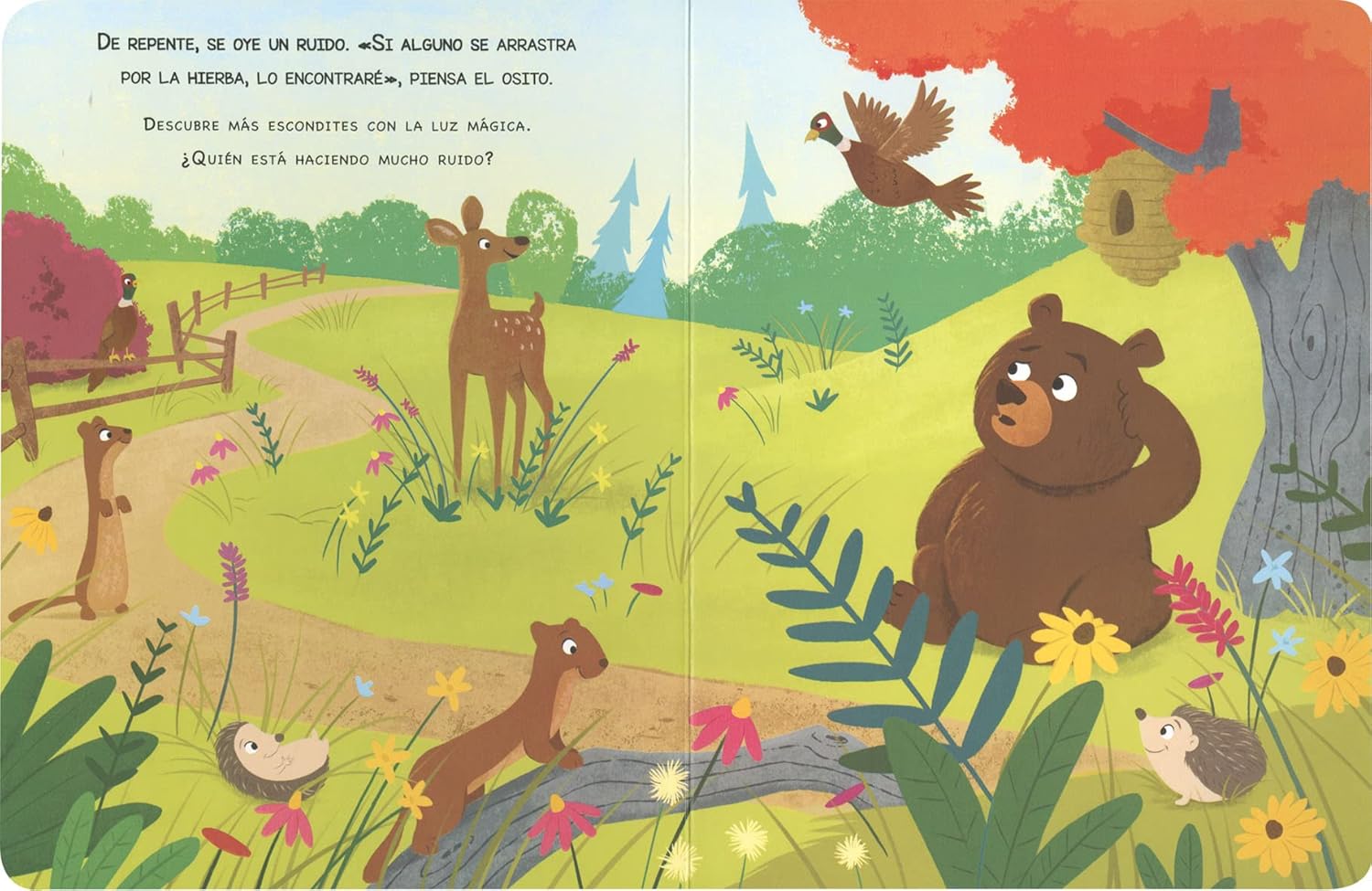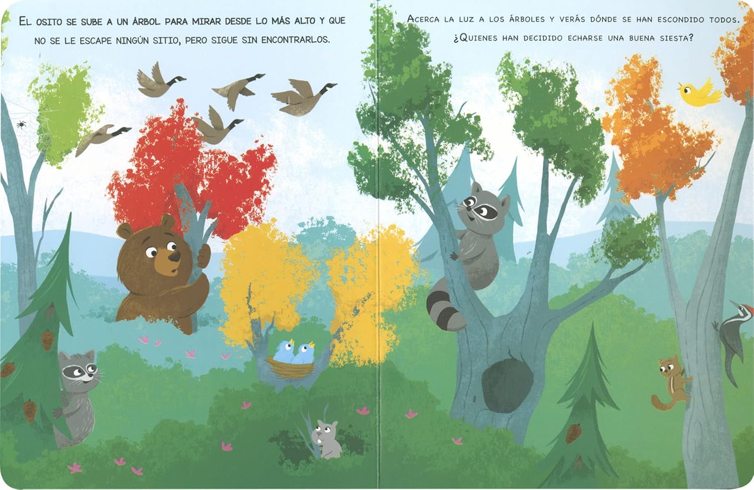 Ilumina tu cuento con este libro de cartón que incluye una linterna para poder ver todos los animales ocultos en el bosque. Lee, busca y ¡sorpréndete!