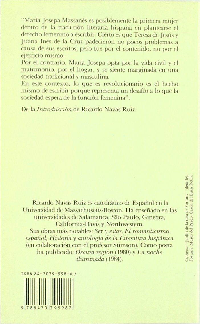 María Josepa Massanés es posiblemente la primera mujer dentro de la tradición literaria hispana en plantearse el derecho femenino a escribir. Cierto es que Teresa de Jesús y Juana Inés de la Cruz padecieron no pocos problemas a causa de sus escritos; pero fue por el contenido, no por el ejercicio del mismo. Por el contrario, María Josepa opta por la vida civil y el matrimonio, por el hogar, y se siente marginada en una sociedad tradicional y masculina. En este contexto, lo que es revolucionario es el hecho mismo de escribir porque representa un desafío a lo que la sociedad espera de la función femenina.