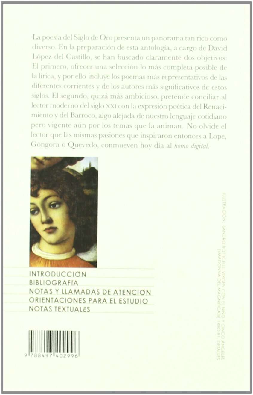 La poesía del Siglo de Oro presenta un panorama tan rico como diverso. En la preparación de esta antología, a cargo de David López del Castillo, se han buscado claramente dos objetivos: El primero, ofrecer una selección lo más completa posible de la lírica, y por ello incluye los poemas más representativos de las diferentes corrientes y de los autores más significativos de estos siglos. El segundo, quizá más ambicioso, pretende conciliar al lector moderno del siglo XXI con la expresión poética del Renacimiento y del Barroco, algo alejada de nuestro lenguaje cotidiano pero vigente aún por los temas que la animan. No olvide el lector que las mismas pasiones que inspiraron entonces a Lope, Góngora o Quevedo, conmueven hoy día al homo digital.