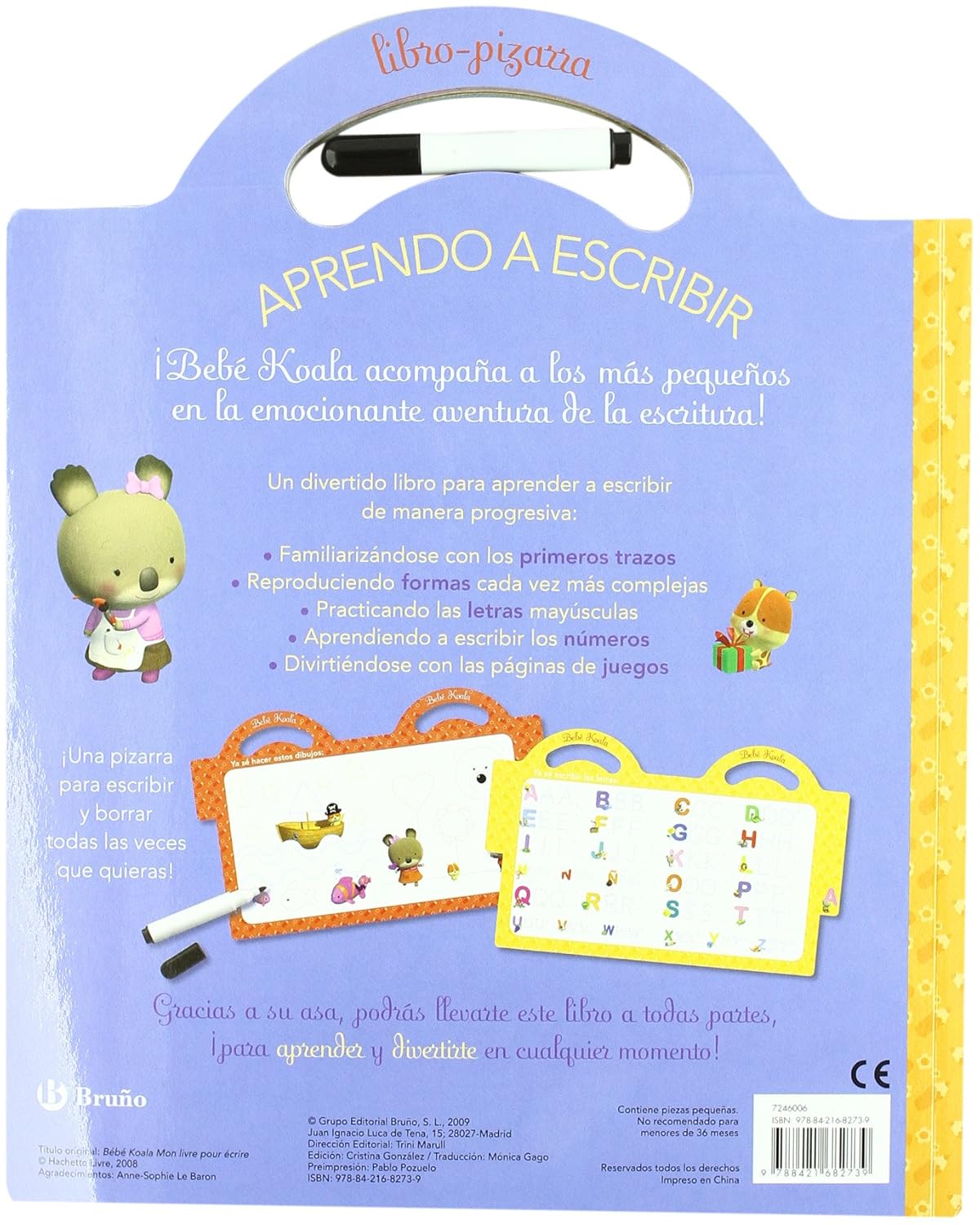 Bebé Koala acompaña a los más pequeños en la emocionante aventura de la escritura con este libro-pizarra para escribir y borrar todas las veces que quieran. Así, se familiarizarán con los primeros trazos, reproducirán formas cada vez más complejas, practicarán las letras mayúsculas, aprenderán a escribir los números y se divertirán con las páginas de juegos. Y, gracias a su asa, los niños podrán llevarse este libro a todas partes.