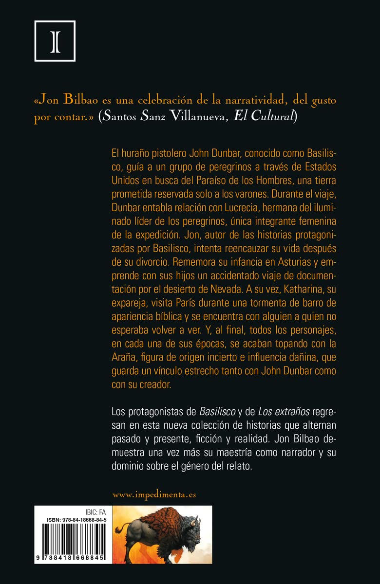 Los protagonistas de Basilisco y de Los extraños regresan en esta nueva colección de historias que alternan pasado y presente, ficción y realidad. Jon Bilbao demuestra una vez más su maestría como narrador y su dominio sobre el género del relato.El huraño pistolero John Dunbar, conocido como Basilisco, guía a un grupo de peregrinos a través de Estados Unidos en busca del Paraíso de los Hombres, una tierra prometida reservada solo a los varones. Durante el viaje, Dunbar entabla relación con Lucrecia, hermana del iluminado líder de los peregrinos, única integrante femenina de la expedición. Jon, autor de las historias protagonizadas por Basilisco, intenta reencauzar su vida después de su divorcio. Rememora su infancia en Asturias y emprende con sus hijos un accidentado viaje de documentación por el desierto de Nevada. A su vez, Katharina, su expareja, visita París durante una tormenta de barro de apariencia bíblica y se encuentra con alguien a quien no esperaba volver a ver. Y, al final, todos los personajes, en cada una de sus épocas, se acaban topando con la Araña, figura de origen incierto e influencia dañina, que guarda un vínculo estrecho tanto con John Dunbar como con su creador.CRÍTICA«Jon Bilbao es una celebración de la narratividad, del gusto por contar.» ―Santos Sanz Villanueva, El Cultural«Jon Bilbao posee una maestría fuera de lo común.» ―Lluís Satorras, Babelia«No nos cansamos de leer libros de Jon Bilbao, uno de los mejores escritores (en el sentido literal, de los que mejor escriben) del panorama nacional.» ―Begoña Alonso, ELLE«El gran mérito de Bilbao es, además de retratar con todas sus virtudes y flaquezas unos personajes impactantes, su notable agilidad, ese ritmo trepidante que nos lleva sin descanso de una historia a otra, sin darnos cuartel.» ―Rosa Martí, Esquire«Jon Bilbao está demostrando libro a libro ser uno de los escritores jóvenes que mejor saben contar una historia.» ―José María Pozuelo Yvancos, ABC Cultural«Jon Bilbao es uno de los autores más singulares del actual panorama literario, un creador de mundos muy personales desde los que disecciona la realidad y ofrece su peculiar punto de vista sobre ella.» ―Ascensión Rivas, El Cultural«Jon Bilbao perfecciona, a cada nuevo libro, su peculiar y, a ratos, muy anglosajón don para aquello que Roberto Bolaño llamó el ejercicio de esgrima.» ―Laura Fernández, Babelia«Jon Bilbao es uno de los escritores más dotados de la actualidad. Domina un trozo del mundo que ha conseguido hacer suyo y donde prima la atención al detalle.» ―Juan Ángel Juristo, ABC Cultural