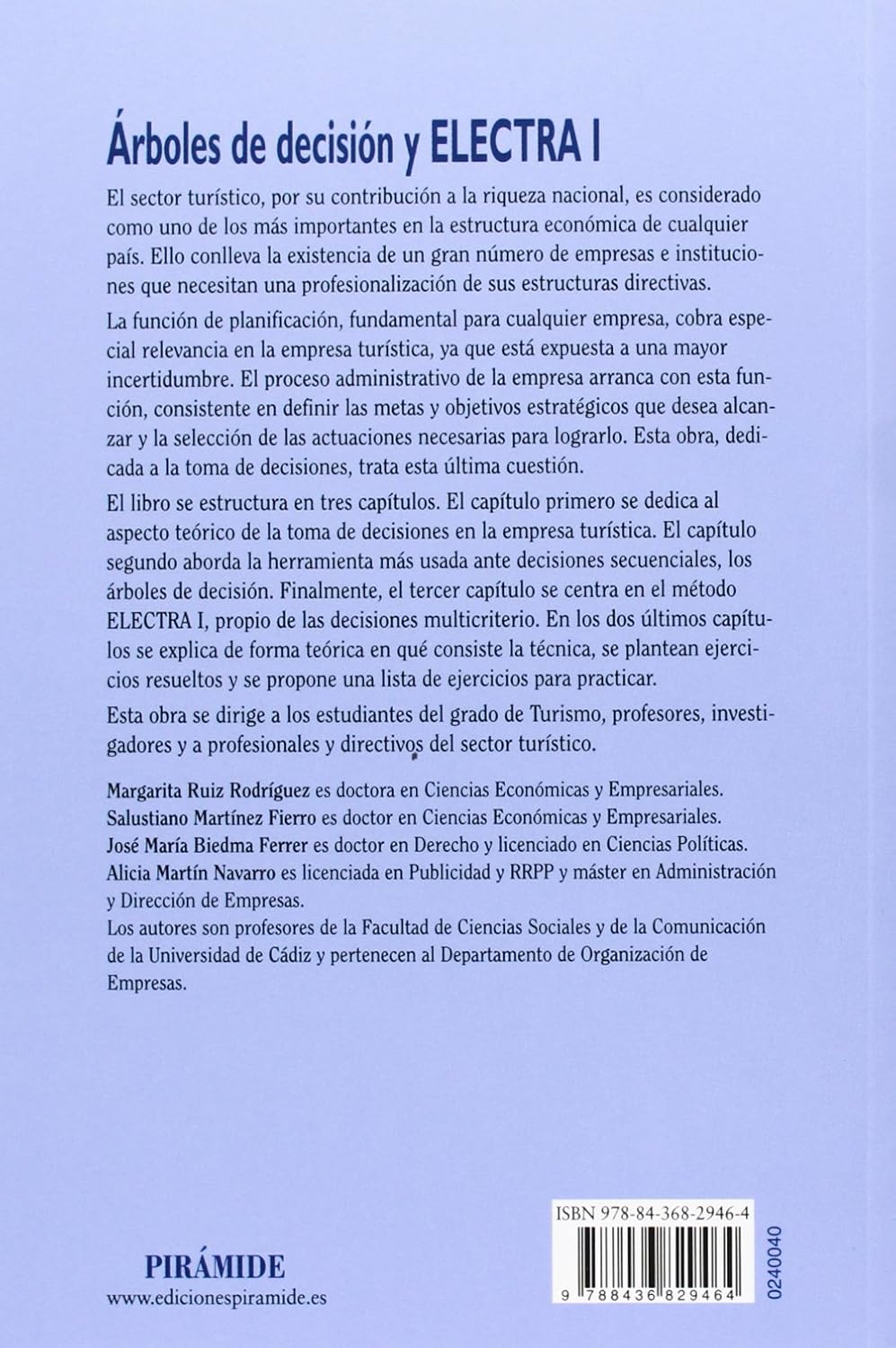 El sector turístico, por su contribución a la riqueza nacional, es considerado como uno de los más importantes en la estructura económica de cualquier país. Ello conlleva la existencia de un gran número de empresas e instituciones que necesitan una profesionalización de sus estructuras directivas. La función de planificación, fundamental para cualquier empresa, cobra especial relevancia en la empresa turística, ya que está expuesta a una mayor incertidumbre. El proceso administrativo de la empresa arranca con esta función, consistente en definir las metas y objetivos estratégicos que desea alcanzar y la selección de las actuaciones necesarias para lograrlo. Esta obra, dedicada a la toma de decisiones, trata esta última cuestión. El libro se estructura en tres capítulos. El capítulo primero se dedica al aspecto teórico de la toma de decisiones en la empresa turística. El capítulo segundo aborda la herramienta más usada ante decisiones secuenciales, los árboles de decisión. Finalmente, el tercer capítulo se centra en el método Electra I, propio de las decisiones multicriterio. En los dos últimos capítulos se explica de forma teórica en qué consiste la técnica, se plantean ejercicios resueltos y se propone una lista de ejercicios para practicar.