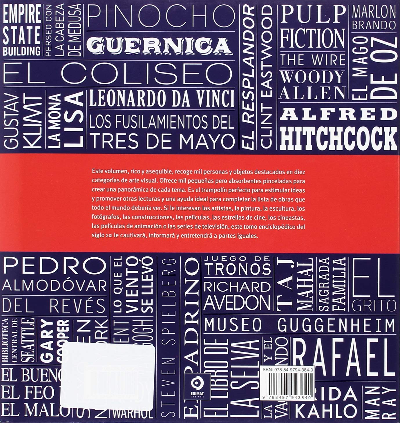 Este volumen, rico y asequible, recoge mil personas y objetos destacados en diez categorías de arte visual. Ofrece mil pequeñas pero absorbentes pinceladas para crear una panorámica de cada tema. Es el trampolín perfecto para estimular ideas y promover otras lecturas y una ayuda ideal para completar la lista de obras que todo el mundo debería ver. Si le interesan los artistas, la pintura, la escultura, los fotógrafos, las construcciones, las películas, las estrellas de cine, los cineastas, las películas de animación o las series de televisión, este tomo enciclopédico del siglo XXI le cautivará, informará y entretendrá a partes iguales.
