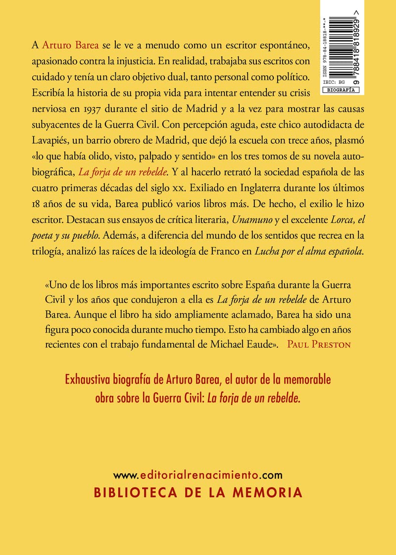 A Arturo Barea se le ve a menudo como un escritor espontáneo, apasionado contra la injusticia. En realidad, trabajaba sus escritos con cuidado y tenía un claro objetivo dual, tanto personal como político. Escribía la historia de su propia vida para intentar entender su crisis nerviosa en 1937 durante el sitio de Madrid y a la vez para mostrar las causas subyacentes de la Guerra Civil. Con percepción aguda, este chico autodidacta de Lavapiés, un barrio obrero de Madrid, que dejó la escuela con trece años, plasmó «lo que había olido, visto, palpado y sentido» en los tres tomos de su novela autobiográfica, La forja de un rebelde. Y al hacerlo retrató la sociedad española de las cuatro primeras décadas del siglo XX. Exiliado en Inglaterra durante los últimos 18 años de su vida, Barea publicó varios libros más. De hecho, el exilio le hizo escritor. Destacan sus ensayos de crítica literaria, Unamuno y el excelente Lorca, el poeta y su pueblo. Además, a diferencia del mundo de los sentidos que recrea en la trilogía, analizó las raíces de la ideología de Franco en Lucha por el alma española. «Uno de los libros más importantes escrito sobre España durante la Guerra Civil y los años que condujeron a ella es La forja de un rebelde de Arturo Barea. Aunque el libro ha sido ampliamente aclamado, Barea ha sido una figura poco conocida durante mucho tiempo. Esto ha cambiado algo en años recientes con el trabajo fundamental de Michael Eaude». Paul Preston Exhaustiva biografía de Arturo Barea, el autor de la memorable obra sobre la Guerra Civil: La forja de un rebelde. Michael Eaude. Británico nacido en Londres, lleva 30 años viviendo entre Barcelona, donde milita en la izquierda radical, y las montañas de Valencia. Ha trabajado de traductor y escritor. Es autor de numerosos artículos para la prensa británica (The Guardian o Times Literary Supplement) sobre literatura y política española y catalana. Hace 30 años emprendió una tesis sobre Arturo Barea, elegido porque su obra aúna sus dos pasiones: literatura y política. Sus libros en castellano incluyen Con el muerto a cuestas, sobre la literatura de Manuel Vázquez Montalbán y su relación con Barcelona, y Movimiento obrero, Cambio político y Resistencia popular (también editado en catalán), sobre la Transición española. En inglés ha publicado Catalonia: a Cultural History y Barcelona, the city that reinvented itself, sobre la transformación de Barcelona de una ciudad gris y pobre en los años sesenta a la ciudad centelleante de arte y diseño de los noventa. En 2019 salió Sails & Winds, que trata la política, historia y cultura del País Valenciano. Su libro más reciente es A People’s History of Catalonia. www.michaeleaude.com Arturo Barea (1897-1957) se crió en Lavapiés, Madrid. Tras abandonar la escuela trabajó en diversos empleos. Durante la guerra del Rif presenció los horrores de la batalla de Annual. Se casó en 1924 y tuvo cuatro hijos. Inquieto y a la deriva, finalmente se divorció. La Guerra Civil le galvanizó. Censor de prensa extranjera en el Madrid asediado, conoció a su segunda mujer Ilsa, una revolucionaria austriaca, y empezó a escribir. Exiliado en Inglaterra, alcanzó la fama con La forja de un rebelde. Publicó varios libros más y se ganó la vida dando charlas semanales en la BBC para Sudamérica. Murió de un infarto en la Navidad de 1957.
