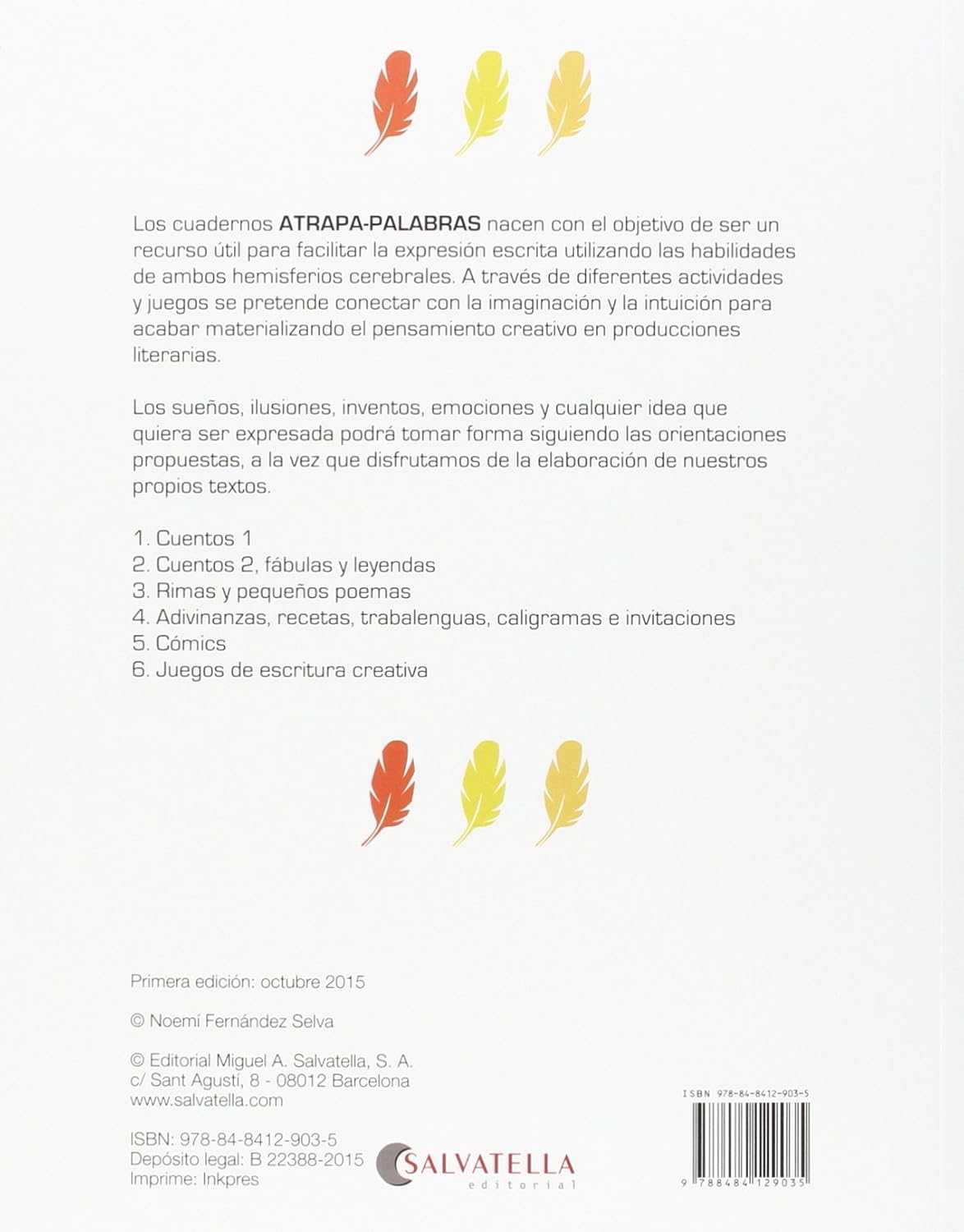 Los cuadernos Atrapa-palabras nacen con el objetivo de ser un recurso útil para facilitar la expresión escrita utilizando las habilidades de ambos hemisferios cerebrales. A través de diferentes actividades y juegos se pretende conectar con la imaginación y la intuición para acabar materializando el pensamiento creativo en producciones literarias.