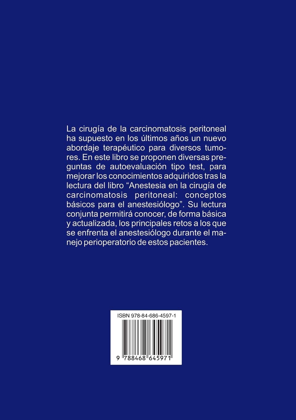 La cirugía de lacarcinomatosis peritoneal ha supuesto en los últimos años un nuevo abordajeterapéutico para diversos tumores. En este libro se proponen diversas preguntasde autoevaluación tipo test, para mejorar los conocimientos adquiridos tras lalectura del libro ?Anestesia en la cirugía de carcinomatosis peritoneal:conceptos básicos para el anestesiólogo?. Su lectura conjunta permitirá conocer,de forma básica y actualizada, los principales retos a los que se enfrenta elanestesiólogo durante el manejo perioperatorio de estos pacientes.