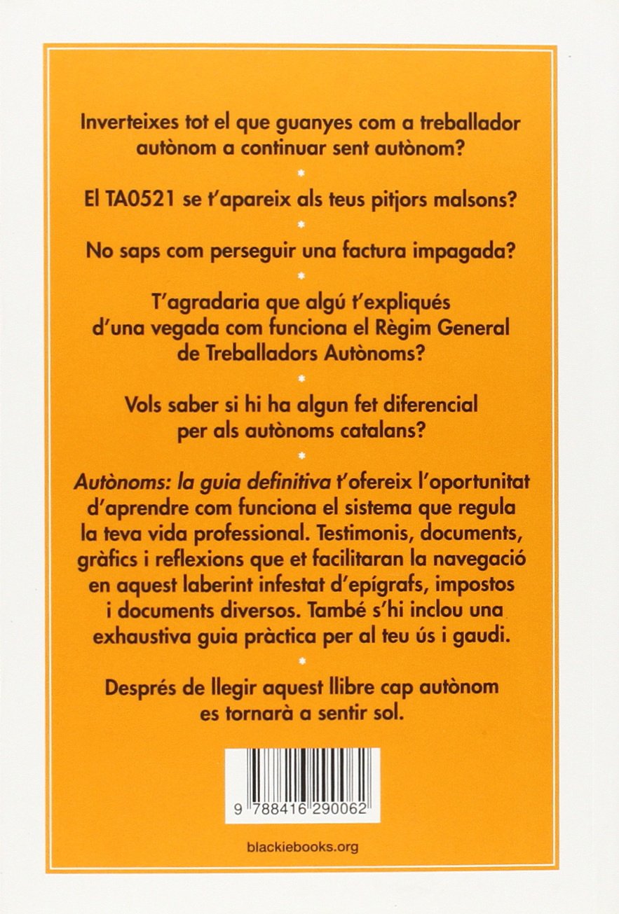 * Inverteixes tot el que guanyes com a treballador autònom a continuar sent autònom? * El TA0521 se tapareix als teus pitjors malsons? * No saps com perseguir una factura impagada? * Tagradaria que algú texpliqués duna vegada com funciona el Règim General de Treballadors Autònoms? * Vols saber si hi ha algun fet diferencial per als autònoms catalans? Ser autònom a Catalunya és difícil (alguns/es diran que a Espanya és difícil ser qualsevol cosa i a Catalunya encara més: i els ho discutiríem) i no sembla que la situació estigui a punt de canviar. En aquest llibre donarem algunes xifres, nanticiparem daltres i en general intentarem omplir alguns buits que ens semblaven rellevants. Però no és un treball profund sobre el panorama econòmic i social dels autònoms sinó més aviat una guia, un manual amb un punt pervers sobre tot allò que sempre vas voler saber sobre els autònoms i mai no vas gosar preguntar. Potser no resoldrà tots els teus dubtes, però de ben segur que quan lacabis hauràs après alguna cosa (no tant com per muntar una gestoria, però Déu nhi do). “Autònoms: la guia definitiva” tofereix loportunitat daprendre com funciona el sistema que regula la teva vida professional. Testimonis, documents, gràfics i reflexions que et facilitaran la navegació en aquest laberint infestat depígrafs, impostos i documents diversos. També shi inclou una exhaustiva guia pràctica per al teu ús i gaudi. Després de llegir aquest llibre cap autònom es tornarà a sentir sol.