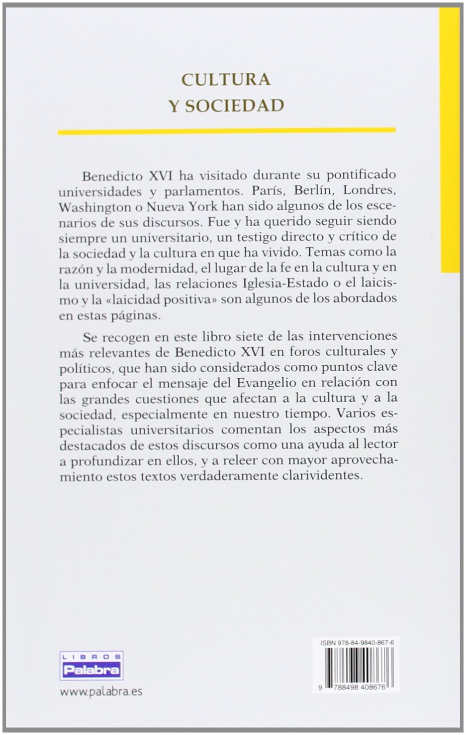 Benedicto XVI ha visitado durante su pontificado universidades y parlamentos. París, Berlín, Londres, Washington o Nueva York han sido algunos de los escenarios de sus discursos. Fue y ha querido seguir siendo siempre un universitario, un testigo directo y crítico de la sociedad y la cultura en que ha vivido. Temas como la razón y la modernidad, el lugar de la fe en la cultura y en la universidad, las relaciones Iglesia-Estado o el laicismo y la “laicidad positiva” son algunos de los abordados en estas páginas.