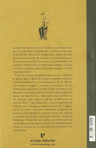 Luciano de Samósata es un escritor, un cómico mordaz y un pensador enmascarado. Luciano es una suerte de Woody Allen de la antigüedad y, como este último, un francotirador de la cultura que hace del humor su arma más mortífera. Luciano es un perturbador, un insolente enfrentado a la hipocresía reinante, la farsa a la que sucumben tanto el hombre antiguo como el contemporáneo. En los dos textos que presentamos en este volumen, la pluma ágil y ligera de Luciano arremete contra la instrumentalización y la banalización de la cultura, tan común en aquel S. II como en nuestro S. XXI. En “El bibliómano ignorante”, Luciano dirige sus feroces e hilarantes acometidas contra un famoso personaje de la época: un hombre rico, aficionado a los jovencitos y los chaperos, que engrosa cada día su biblioteca con nuevos libros -que nunca lee- con la esperanza de mejorar así su imagen y posición social. En el segundo de los textos, “Si busca la vida buena, ¡compre uno de nuestros estilos filosóficos!”, Luciano recrea una delirante subasta de filósofos en la cual Sócrates, Pitágoras, Diógenes o Heráclito son puestos a la venta ante una masa diletante que aspira a obtener la vida buena mediante la compra de un pensador de renombre y sus enseñanzas.