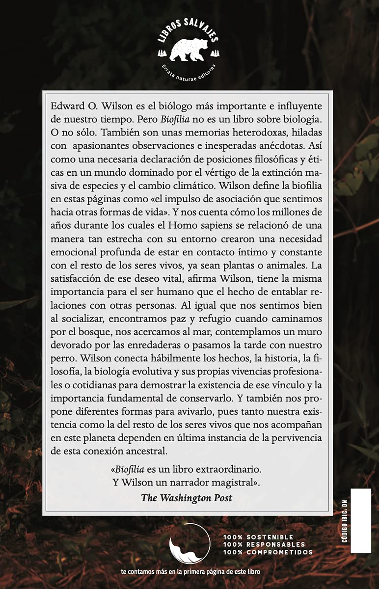 Edward O. Wilson es el biólogo más importante e influyente de nuestro tiempo. Pero «Biofilia» no es un libro sobre biología. O no sólo. También son unas memorias heterodoxas, hiladas con apasionantes observaciones e inesperadas anécdotas. Así como una necesaria declaración de posiciones filosóficas y éticas en un mundo dominado por el vértigo de la extinción masiva de especies y el cambio climático. Wilson define la biofilia en estas páginas como «el impulso de asociación que sentimos hacia otras formas de vida». Y nos cuenta cómo los millones de años durante los cuales el Homo sapiens se relacionó de una manera tan estrecha con su entorno crearon una necesidad emocional profunda de estar en contacto íntimo y constante con el resto de los seres vivos, ya sean plantas o animales. La satisfacción de ese deseo vital, afirma Wilson, tiene la misma importancia para el ser humano que el hecho de entablar relaciones con otras personas. Al igual que nos sentimos bien al socializar, encontramos paz y refugio cuando caminamos por el bosque, nos acercamos al mar, contemplamos un muro devorado por las enredaderas o pasamos la tarde con nuestro perro. Wilson conecta hábilmente los hechos, la historia, la filosofía, la biología evolutiva y sus propias vivencias profesionales o cotidianas para demostrar la existencia de ese vínculo y la importancia fundamental de conservarlo. Y también nos propone diferentes formas para avivarlo, pues tanto nuestra existencia como la del resto de los seres vivos que nos acompañan en este planeta dependen en última instancia de la pervivencia de esta conexión ancestral.