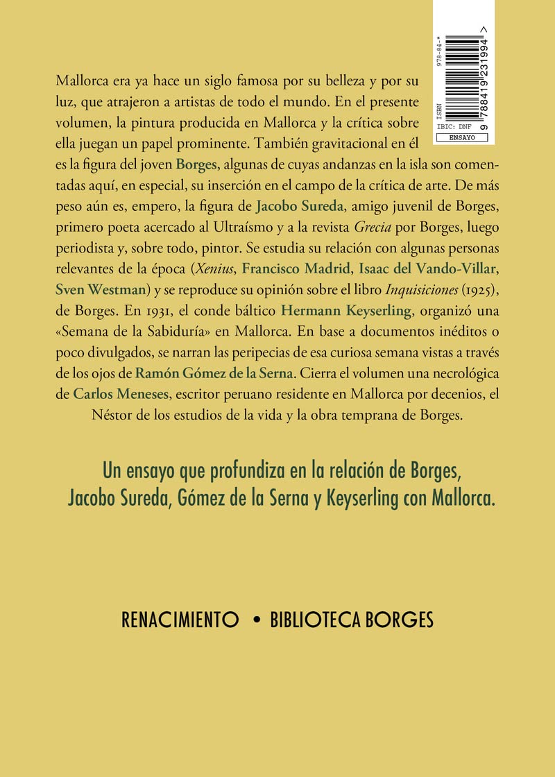 Mallorca era ya hace un siglo famosa por su belleza y por su luz, que atrajeron a artistas de todo el mundo. En el presente volumen, la pintura producida en Mallorca y la crítica sobre ella juegan un papel prominente. También gravitacional en él es la figura del joven Borges, algunas de cuyas andanzas en la isla son comentadas aquí, en especial, su inserción en el campo de la crítica de arte. De más peso aún es, empero, la figura de Jacobo Sureda, amigo juvenil de Borges, primero poeta acercado al Ultraísmo y a la revista Grecia por Borges, luego periodista y, sobre todo, pintor. Se estudia su relación con algunas personas relevantes de la época (Xenius, Francisco Madrid, Isaac del Vando-Villar, Sven Westman) y se reproduce su opinión sobre el libro Inquisiciones (1925), de Borges. En 1931, el conde báltico Hermann Keyserling, organizó una «Semana de la Sabiduría» en Mallorca. En base a documentos inéditos o poco divulgados, se narran las peripecias de esa curiosa semana vistas a través de los ojos de Ramón Gómez de la Serna. Cierra el volumen una necrológica de Carlos Meneses, escritor peruano residente en Mallorca por decenios, el Néstor de los estudios de la vida y la obra temprana de Borges. Un ensayo que profundiza en la relación de Borges, Jacobo Sureda, Gómez de la Serna y Keyserling con Mallorca. Carlos García nació en Buenos Aires en 1953. Se trasladó a España en marzo de 1977. Vive en Hamburgo (Alemania) desde 1979. Investigador independiente, se ha especializado en la vanguardia histórica de Argentina, Chile, España, México y Perú, así como en la edición comentada de correspondencias literarias. Sobre estos temas ha publicado una cuarentena de libros en España, Argentina y México. Algunos de sus últimos títulos, a partir de 2018: Borges, mal lector; Pedro Salinas-Guillermo de Torre. Correspondencia 1927-1950 (con Juana María González); 2019: Dossier Guillermo de Torre (coordinado con Pablo Rojas); Epistolario de Ricardo Gullón y Guillermo de Torre, 1934-1970 (con Pablo Rojas); Ultraísmos, 1919-1924; Guillermo de Torre, 120 años (coordinador); Umbrales de vanguardia (coordinador); 2022: Guillermo de Torre en Argentina. Crítico, historiador, corresponsal. En relación con los temas aquí tratados es relevante su edición anotada del epistolario entre Jorge Luis Borges y Jacobo Sureda: Cartas del fervor (1999), así como su libro El joven Borges, poeta, 1919-1930 (2000).