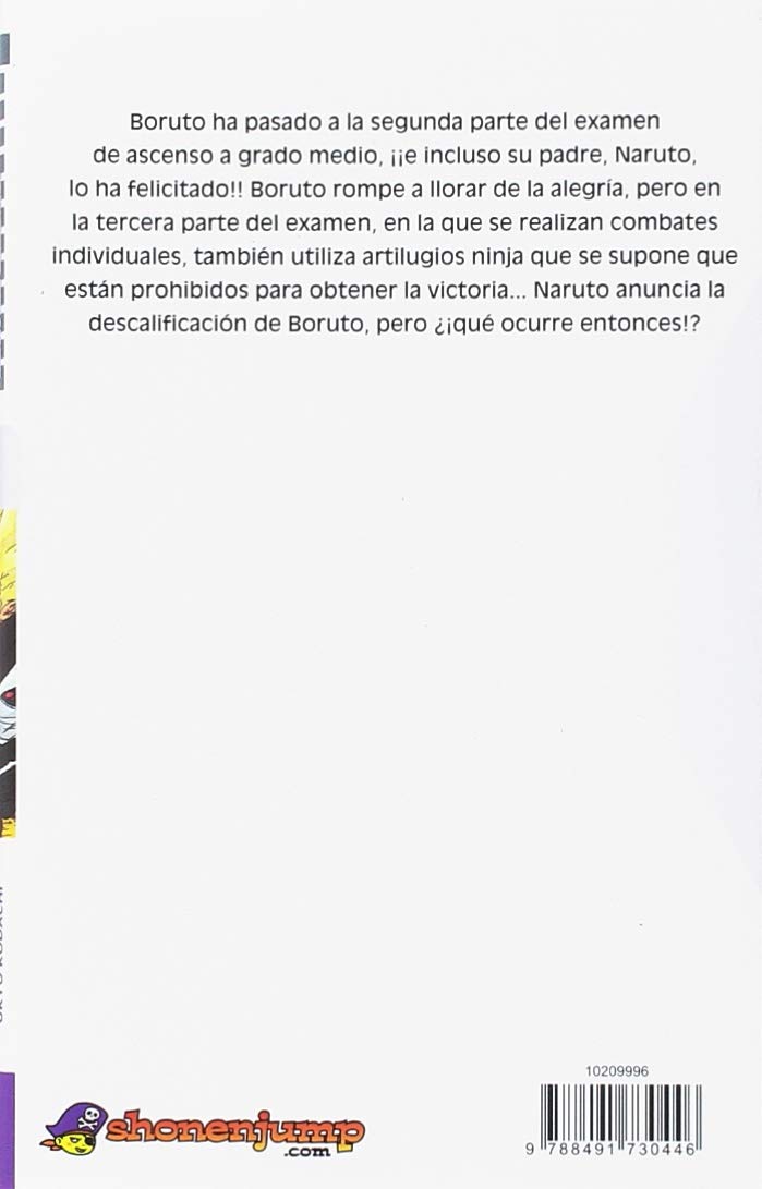 ¡Un nuevo tomo de las aventuras de Boruto! ¿¡Conseguirá salir de la sombra de su padre, Naruto, y hacerse un nombre!?Boruto ha superado la segunda prueba del examen de ascenso a grado medio, ¡¡e incluso su padre, Naruto, lo ha felicitado!! Boruto rompe a llorar de la alegría, pero, de todos modos, hace uso de la herramienta científica ninja, que se supone que está prohibida, para obtener la victoria en la tercera prueba, que consiste en un combate individual. Sin embargo, ¡en el momento en el que Naruto anuncia la descalificación de Boruto…!