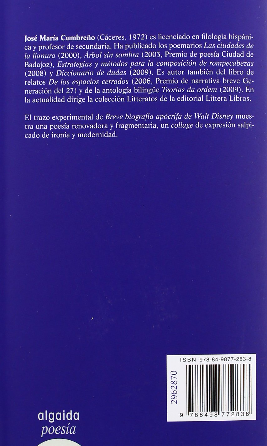 José María Cumbreño (Cáceres, 1972) es licenciado en filología hispánica y profesor de secundaria. Ha publicado los poemarios Las ciudades de la llanura (2000), Árbol sin sombra (2003, Premio de poesía Ciudad de Badajoz), Estrategias y métodos para la composición de rompecabezas (2008) y Diccionario de dudas (2009). Es autor también del libro de relatos De los espacios cerrados (2006, Premio de narrativa breve Generación del 27) y de la antología bilingüe Teorias da ordem (2009). En la actualidad dirige la colección Litteratos de la editorial Littera Libros. El trazo experimental de Breve Biografía apócrifa de Walt Disney muestra una poesía renovadora y fragmentaria, un collage de expresión salpicado de ironía y modernidad.