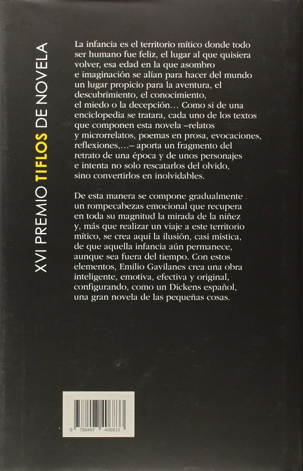 La infancia es el territorio mítico donde todo ser humano fue feliz, el lugar al que quisiera volver, esa edad en la que asombro e imaginación se alían para hacer del mundo un lugar propicio para la aventura, el descubrimiento, el conocimiento, el miedo o la decepción… Como si de una enciclopedia se tratara, cada uno de los textos que componen esta novela -relatos y microrrelatos, poemas en prosa, evocaciones, reflexiones,…- aporta un fragmento del retrato de una época y de unos personajes e intenta no solo rescatarlos del olvido, sino convertirlos en inolvidables. De esta manera se compone gradualmente un rompecabezas emocional que recupera en toda su magnitud la mirada de la niñez y, más que realizar un viaje a este territorio mítico, se crea aquí la ilusión, casi mística, de que aquella infancia aún permanece, aunque sea fuera del tiempo. Con estos elementos, Emilio Gavilanes crea una obra inteligente, emotiva, efectiva y original, configurando, como un Dickens español, una gran novela de las pequeñas cosas.