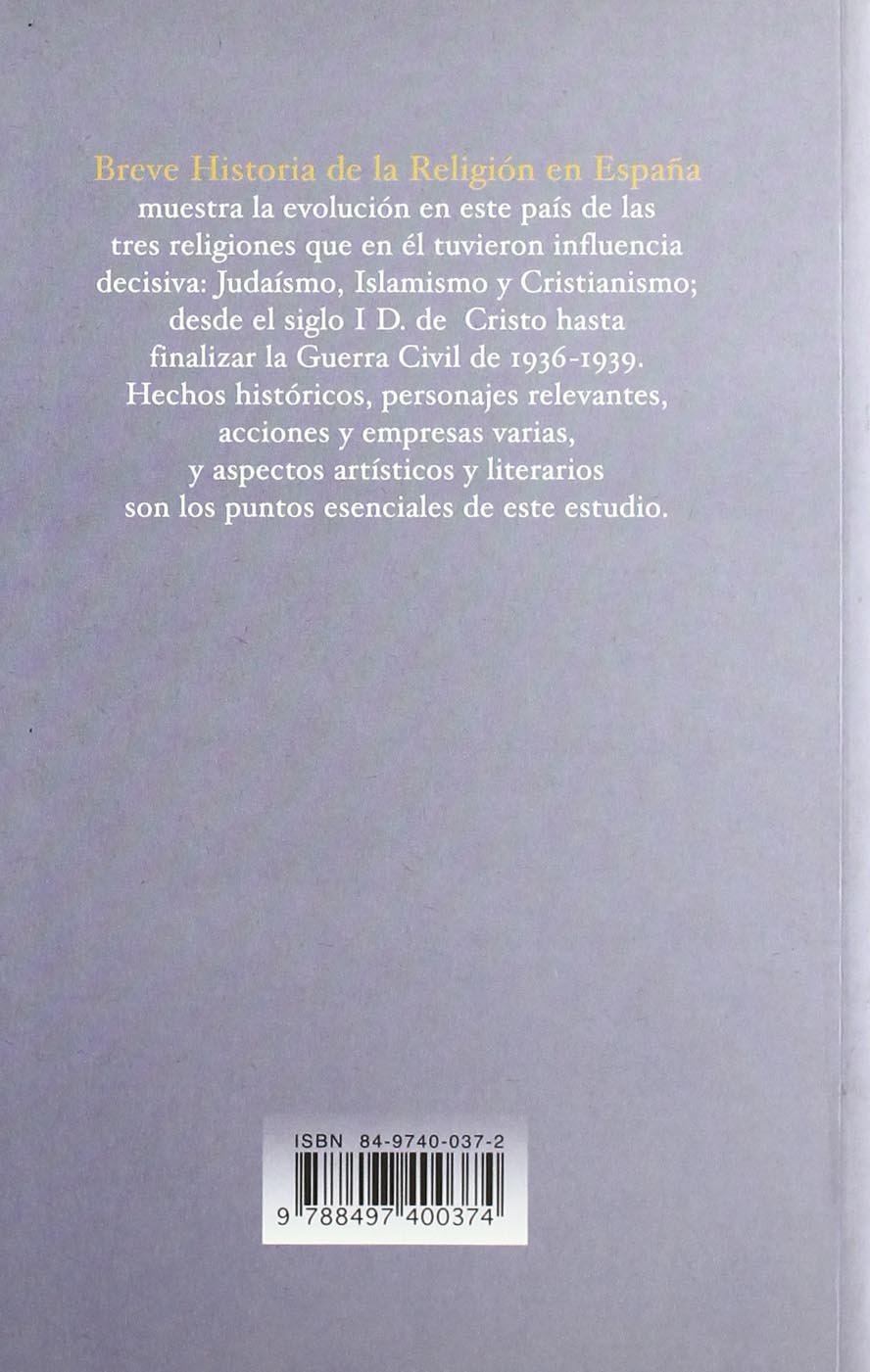 La historia de la Religión en un país con características tan específicas y singulares como España está marcada con claridad por signos históricos de muy diversa índole que han dado lugar, a lo largo de los siglos a tres factores fundamentales del ser de España: cristianismo, judaísmo e islamismo. Desde el siglo I d. de Cristo hasta finalizar la Guerra Civil de 1936-1939.Hechos históricos, personajes relevantes, acciones y empresas varias, y aspectos artísticos y literarios son los puntos esenciales de este estudio.