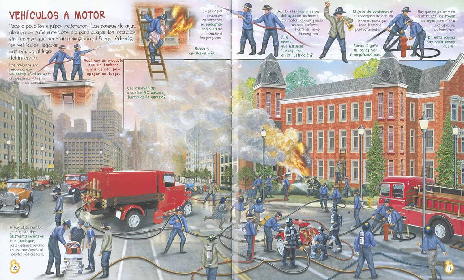 Un título más en esta colección para aprender y disfrutar buscando los numerosos animales, personas y objetos de todo tipo que se esconden en sus sorprendentes ilustraciones. En esta ocasión, se trata de los bomberos y su mundo: el fuego, los primeros vehículos, los equipos, rescates en el mar, etc., ¡todo un desafío!