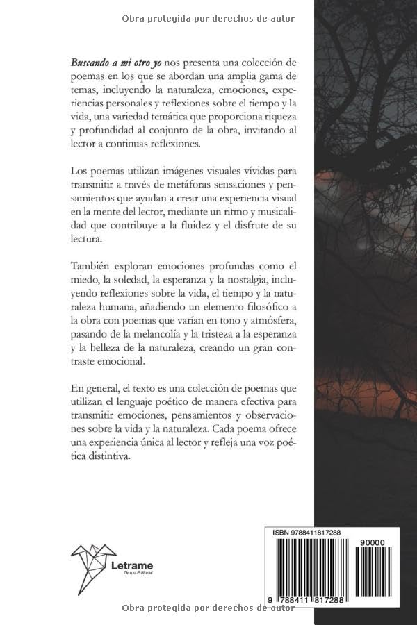Buscando a mi otro yo nos presenta una colección de poemas en los que se abordan una amplia gama de temas, incluyendo la naturaleza, emociones, experiencias personales y reflexiones sobre el tiempo y la vida, una variedad temática que proporciona riqueza y profundidad al conjunto de la obra, invitando al lector a continuas reflexiones.Los poemas utilizan imágenes visuales vívidas para transmitir a través de metáforas sensaciones y pensamientos que ayudan a crear una experiencia visual en la mente del lector, mediante un ritmo y musicalidad que contribuye a la fluidez y el disfrute de su lectura.También exploran emociones profundas como el miedo, la soledad, la esperanza y la nostalgia, incluyendo reflexiones sobre la vida, el tiempo y la naturaleza humana, añadiendo un elemento filosófico a la obra con poemas que varían en tono y atmósfera, pasando de lamelancolía y la tristeza a la esperanza y la belleza de la naturaleza, creando un gran contraste emocional.En general, el texto es una colección de poemas que utilizan el lenguaje poético de manera efectiva para transmitir emociones, pensamientos y observaciones sobre la vida y la naturaleza. Cada poema ofrece una experiencia única al lector y refleja una voz poética distintiva.