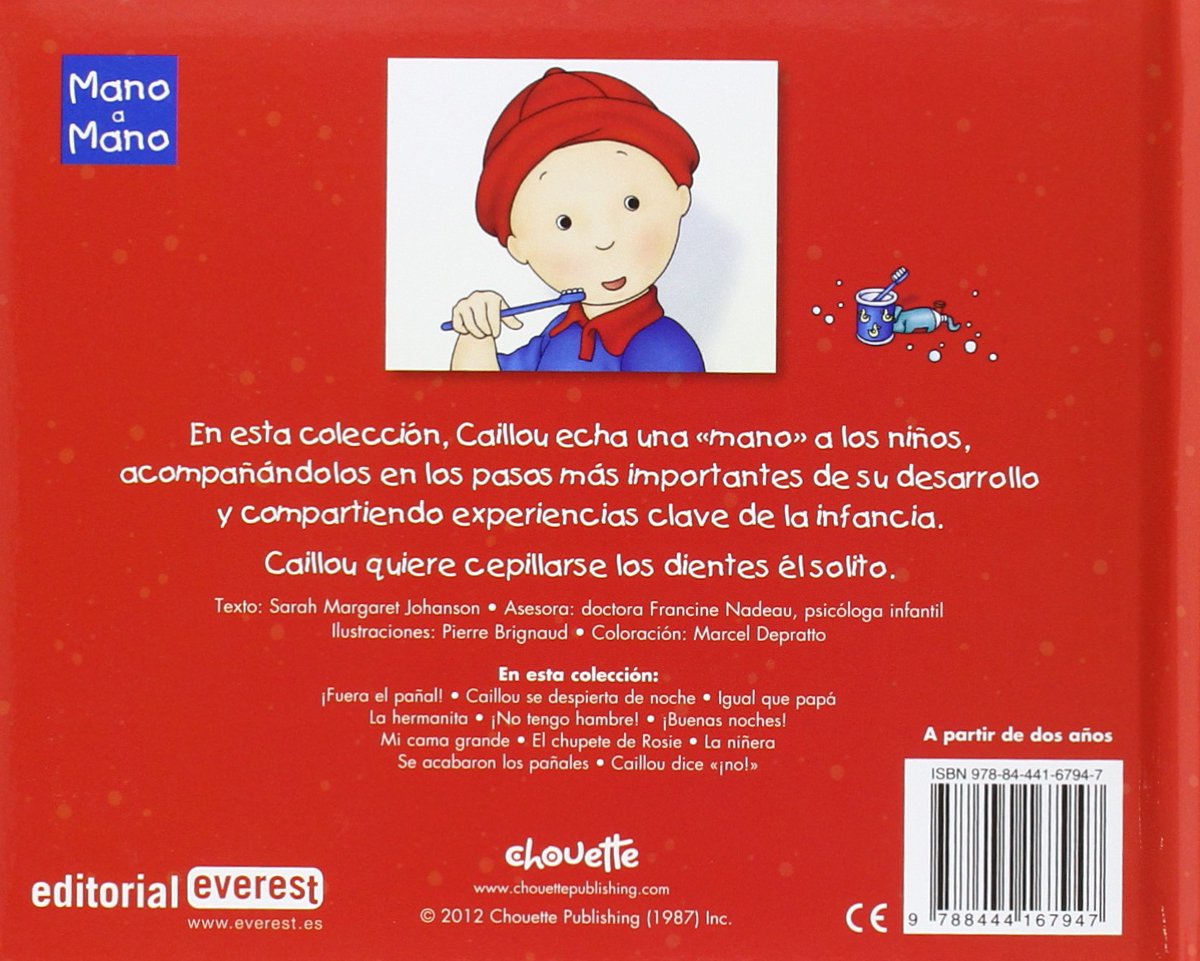 Cada día mamá le cepilla los dientes a Caillou. Usa una pasta de dientes especial y hace suaves círculos hasta que quedan muy limpitos. Pero, un día, Caillou decide que ya puede lavarse los dientes él solito… Con este libro de la colección Mano a mano, los niños aprenderán, igual que Caillou, la importancia de cepillarse los dientes. ¡Además, les hará mucha ilusión usar el cepillo de dientes especial de Caillou!