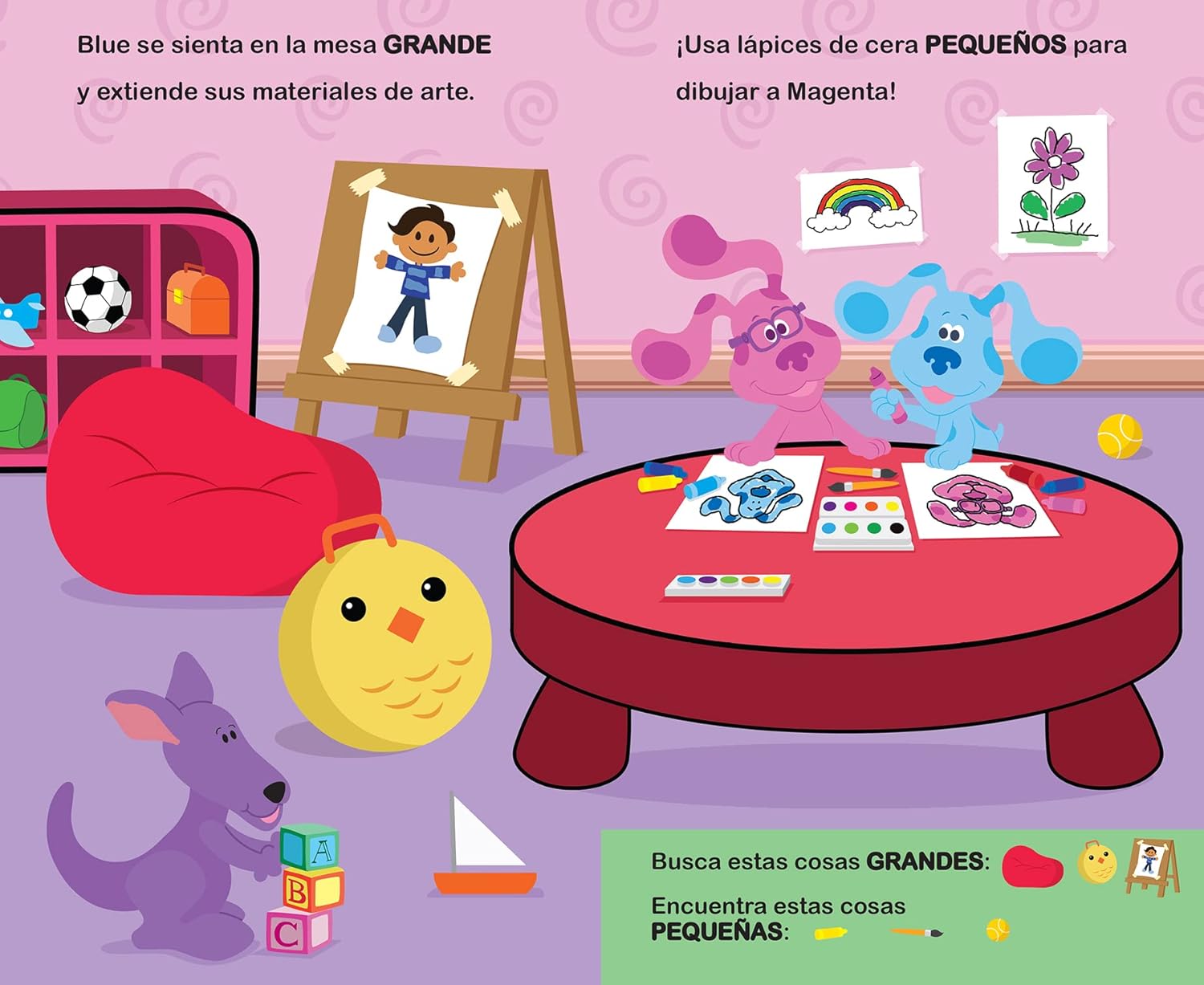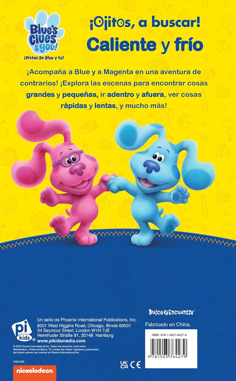 ¡Ojitos, a buscar! Caliente y Frío ¡Acompaña a Blue y a Magenta en una aventura de contrarios! ¡Explora las escenas para encontrar cosas grandes y pequeñas, ir adentro y afuera, ver cosas rápidas y lentas, y mucho más!