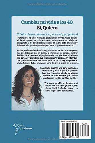¿Y ahora qué? No tengo ni idea de qué hacer con mi vida. Acabo de cumplir los 40 o puede que ya los sobrepase; me he quedado sin trabajo; me he separado de mi pareja; estoy pensando en dejarlo todo, emprender y dedicarme a lo que siempre quise pero no sé ni por dónde empezar…Muchas pueden ser las situaciones y circunstancias, tantas como personas, pero todas con algo en común, la intención y las ganas de cambiar de vida a los 40 y esta es mi propia historia, una más, la de mi reinvención personal y profesional que quiero compartir contigo, sin más intención que la de mostrarte todo lo que yo he hecho, mi propia experiencia, mis baches, mis dudas, mis miedos por si te sirve o inspira en tu proceso.Encontrarás también una parte dedicada a herramientas y recursos prácticos para realizar esta transición además de algunas historias de otras personas que también consiguieron cambiar su vida a los 40. Y a partir de ahí, la decisión y el camino será solo tuyo. ¡Mucha fuerza! ¡Mucha ilusión! ¡Mucha pasión! La suerte llegará como consecuencia.
