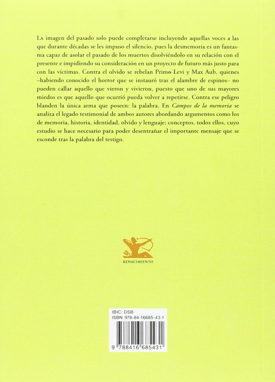 La imagen del pasado solo puede completarse incluyendo aquellas voces a las que durante décadas se les impuso el silencio, pues la desmemoria es un fantasma capaz de asolar el pasado de los muertos disolviéndolo en su relación con el presente e impidiendo su consideración en un proyecto de futuro más justo para con las víctimas. Contra el olvido se rebelan Primo Levi y Max Aub, quienes habiendo conocido el horror que se instauró tras el alambre de espinos no pueden callar aquello que vieron y vivieron, puesto que uno de sus mayores miedos es que aquello que ocurrió pueda volver a repetirse. Contra ese peligro blanden la única arma que poseen: la palabra. En Campos de la memoria se analiza el legado testimonial de ambos autores abordando argumentos como los de memoria, historia, identidad, olvido y lenguaje; conceptos, todos ellos, cuyo estudio se hace necesario para poder desentrañar el importante mensaje que se esconde tras la palabra del testigo. María Soler Sola (Valencia, 1981) es licenciada en Filología Hispánica por la Universidad Autónoma de Barcelona y doctora en Lingue e Culture del Mediterraneo por la Università degli Studi di Firenze. Ha trabajado como profesora contratada en la Università degli Studi di Siena y como profesora de didáctica de la lengua española en la Università degli Studi S. Pio V de Roma. Su campo de especialización es la literatura contemporánea y ultracontemporánea que se ocupa de memoria histórica y testimonio.