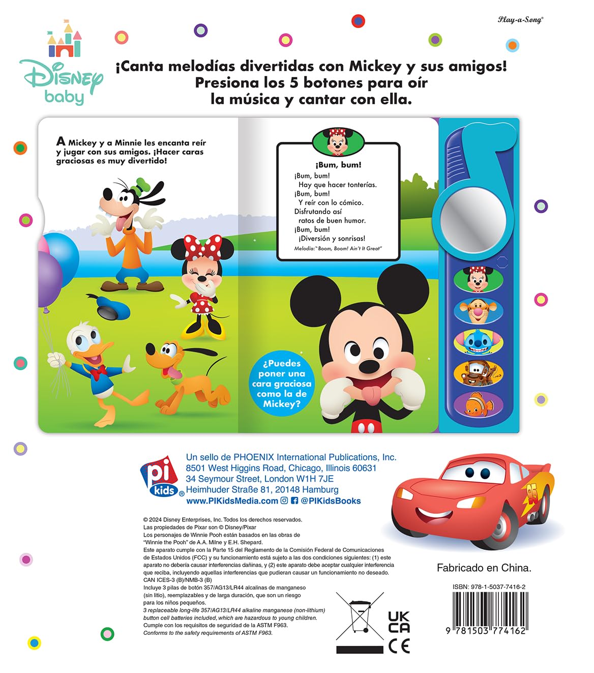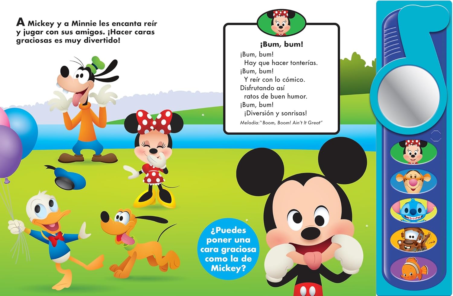 Canta melodías divertidas con Mickey y sus amigos. Presiona los 5 botones para oír la música y cantar con ella. Puedes mirarte al espejo mientras cantas y poner caritas divertidas.