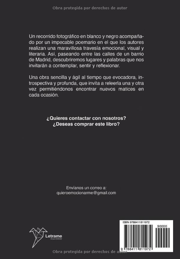 Un recorrido fotográfico en blanco y negro acompañado por un impecable poemario en el que los autores realizan una maravillosa travesía emocional, visual y literaria. Así, paseando entre las calles de un barrio de Madrid, descubriremos lugares y palabras que nos invitarán a contemplar, sentir y reflexionar. Una obra sencilla y ágil, al tiempo que evocadora, introspectiva y profunda; que invita a releerla una y otra vez, permitiéndonos encontrar nuevos matices en cada ocasión.¿Quieres contactar con nosotros? ¿Deseas comprar este libro?Envíanos un correo a: [email protected]