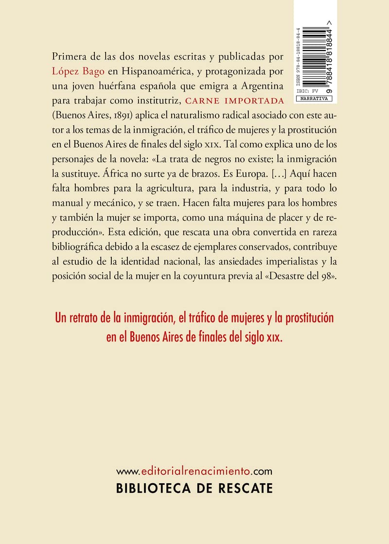 Primera de las dos novelas escritas y publicadas por López Bago en Hispanoamérica, y protagonizada por una joven huérfana española que emigra a Argentina para trabajar como institutriz, Carne importada (Buenos Aires, 1891) aplica el naturalismo radical asociado con este autor a los temas de la inmigración, el tráfico de mujeres y la prostitución en el Buenos Aires de finales del siglo XIX. Tal como explica uno de los personajes de la novela: «La trata de negros no existe; la inmigración la sustituye. África no surte ya de brazos. Es Europa. […] Aquí hacen falta hombres para la agricultura, para la industria, y para todo lo manual y mecánico, y se traen. Hacen falta mujeres para los hombres y también la mujer se importa, como una máquina de placer y de reproducción». Esta edición, que rescata una obra convertida en rareza bibliográfica debido a la escasez de ejemplares conservados, contribuye al estudio de la identidad nacional, las ansiedades imperialistas y la posición social de la mujer en la coyuntura previa al «Desastre del 98». Un retrato de la inmigración, el tráfico de mujeres y la prostitución en el Buenos Aires de finales del siglo XIX. Eduardo López-Bago y Peñalver. Nació en Aranjuez en 1853. Sus inicios literarios en el ámbito conservador y monárquico dieron paso al cultivo de un naturalismo radical que le convirtió en uno de los novelistas más populares (y polémicos) de la época. Tras los escándalos suscitados por La prostituta. Novela médico-social (1884) y otra docena de títulos, López Bago se desplaza a Hispanoamérica en 1888, donde residirá hasta 1914. Durante sus estancias en Uruguay, Argentina, México y Cuba, se involucró tanto en el periodismo como en la política, además de publicar sus dos últimas novelas: Carne importada (Buenos Aires, 1891) y El separatista (La Habana, 1895). Murió en Alicante en 1931. Luis Álvarez Castro. Catedrático de literatura española y director del Departamento de Español y Portugués en la Universidad de Florida, se doctoró en Filología Hispánica por la Universidad de Valladolid y en Literatura y Cultura Española por The Ohio State University. Es autor de los libros El universo femenino de Ángel Ganivet (1996), La palabra y el ser en la teoría literaria de Unamuno (2005), y Los espejos del yo: existencialismo y metaficción en la narrativa de Unamuno (2015), y editor del volumen colectivo Approaches to Teaching the Works of Miguel de Unamuno (2020).