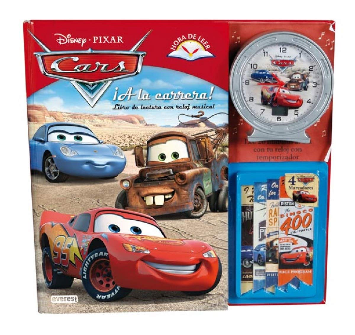 Es hora de leer con la pandilla de Cars! Con este libro y el reloj musical, los aficionados a las carreras disfrutarán leyendo (o escuchando) durante los recomendados veinte minutos diarios. El libro contiene la historia completa de la película, fragmentada en capítulos de veinte minutos de duración. El reloj sirve también como cronómetro de lectura; puede ser fijado para periodos de entre cinco y veinte minutos. Los niños disfrutarán con la melodía musical que suena cuando termina el tiempo de lectura.