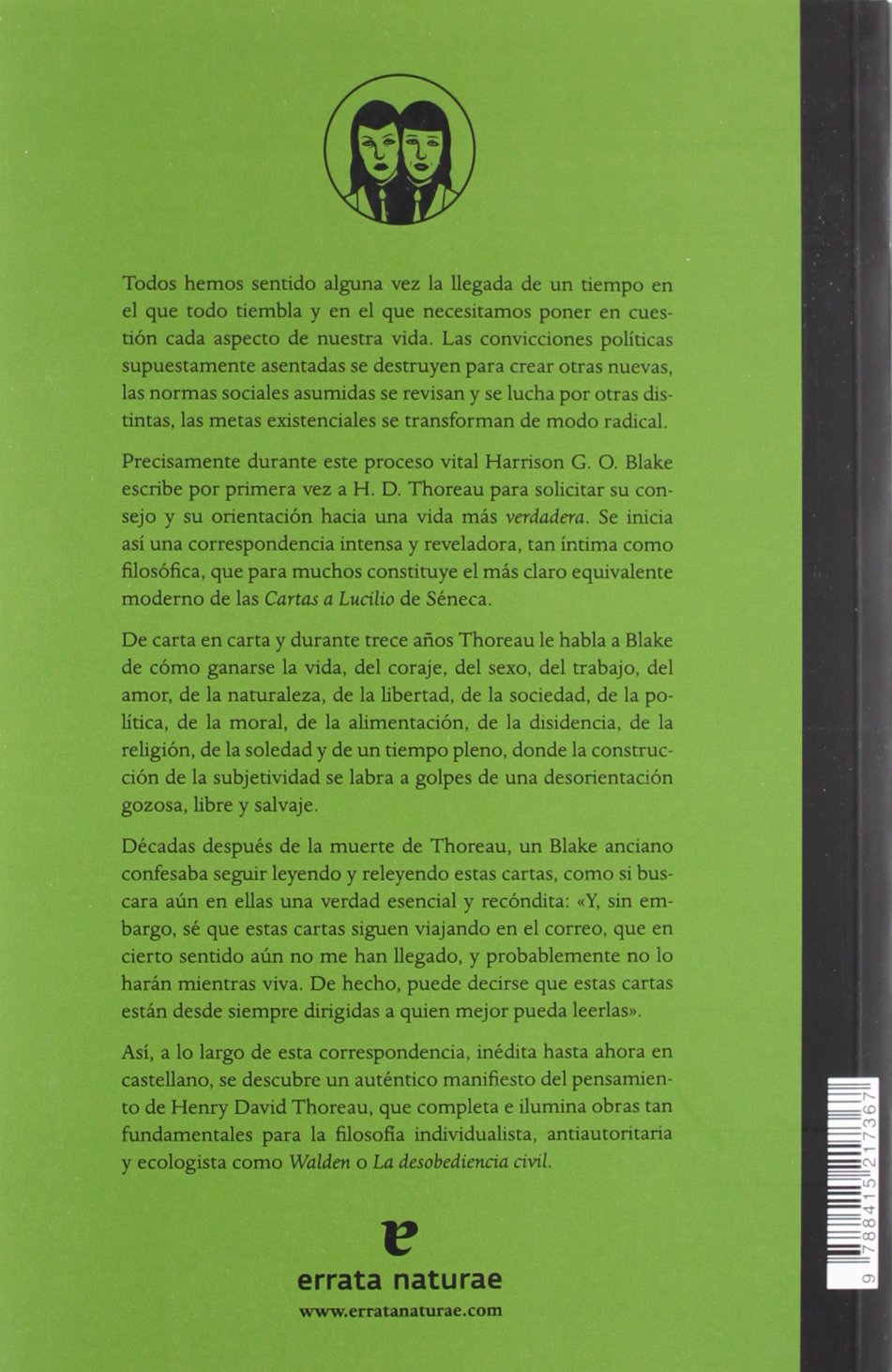 Todos hemos sentido alguna vez la llegada de un tiempo en el que todo tiembla y en el que necesitamos poner en cuestión cada aspecto de nuestra vida. Las convicciones políticas supuestamente asentadas se destruyen para crear otras nuevas, las normas sociales asumidas se revisan y se lucha por otras distintas, las metas existenciales se transforman de modo radical. Precisamente durante este proceso vital Harrison G. O. Blake escribe por primera vez a H. D. Thoreau para solicitar su consejo y su orientación hacia una vida más verdadera. Se inicia así una correspondencia intensa y reveladora, tan íntima como filosófica, que para muchos constituye el más claro equivalente moderno de las Cartas a Lucilio de Séneca. De carta en carta y durante trece años Thoreau le habla a Blake de cómo ganarse la vida, del coraje, del sexo, del trabajo, del amor, de la naturaleza, de la libertad, de la sociedad, de la política, de la moral, de la alimentación, de la disidencia, de la religión, de la soledad y de un tiempo pleno, donde la construcción de la subjetividad se labra a golpes de una desorientación gozosa, libre y salvaje. Décadas después de la muerte de Thoreau, un Blake anciano confesaba seguir leyendo y releyendo estas cartas, como si bus¬cara aún en ellas una verdad esencial y recóndita: «Y, sin embargo, sé que estas cartas siguen viajando en el correo, que en cierto sentido aún no me han llegado, y probablemente no lo harán mientras viva. De hecho, puede decirse que estas cartas están desde siempre dirigidas a quien mejor pueda leerlas». Así, a lo largo de esta correspondencia, inédita hasta ahora en castellano, se descubre un auténtico manifiesto del pensamiento de Henry David Thoreau, que completa e ilumina obras tan fundamentales para la filosofía individualista, antiautoritaria y ecologista como “Walden” o “La desobediencia civil”.
