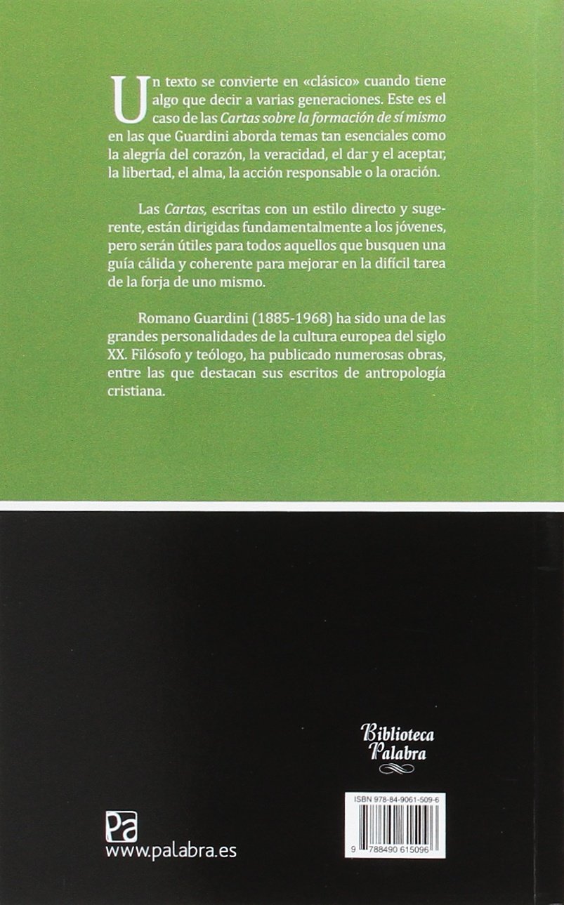 En este libro el autor aborda temas tan esenciales como la alegría del corazón, la veracidad, el dar y aceptar, la libertad, el alma, la acción responsable o la oración. Un texto se convierte en “clásico” cuando tiene algo que decir a varias generaciones. Este es el caso de las Cartas sobre la formación de sí mismo en las que Guardini aborda temas tan esenciales como la alegría del corazón, la veracidad, el dar y el aceptar, la libertad, el alma, la acción responsable o la oración. Las Cartas, escritas con un estilo directo y sugerente, están dirigidas fundamentalmente a los jóvenes, pero serán útiles para todos aquellos que busquen una guía cálida y coherente para mejorar en la difícil tarea de la forja de uno mismo.