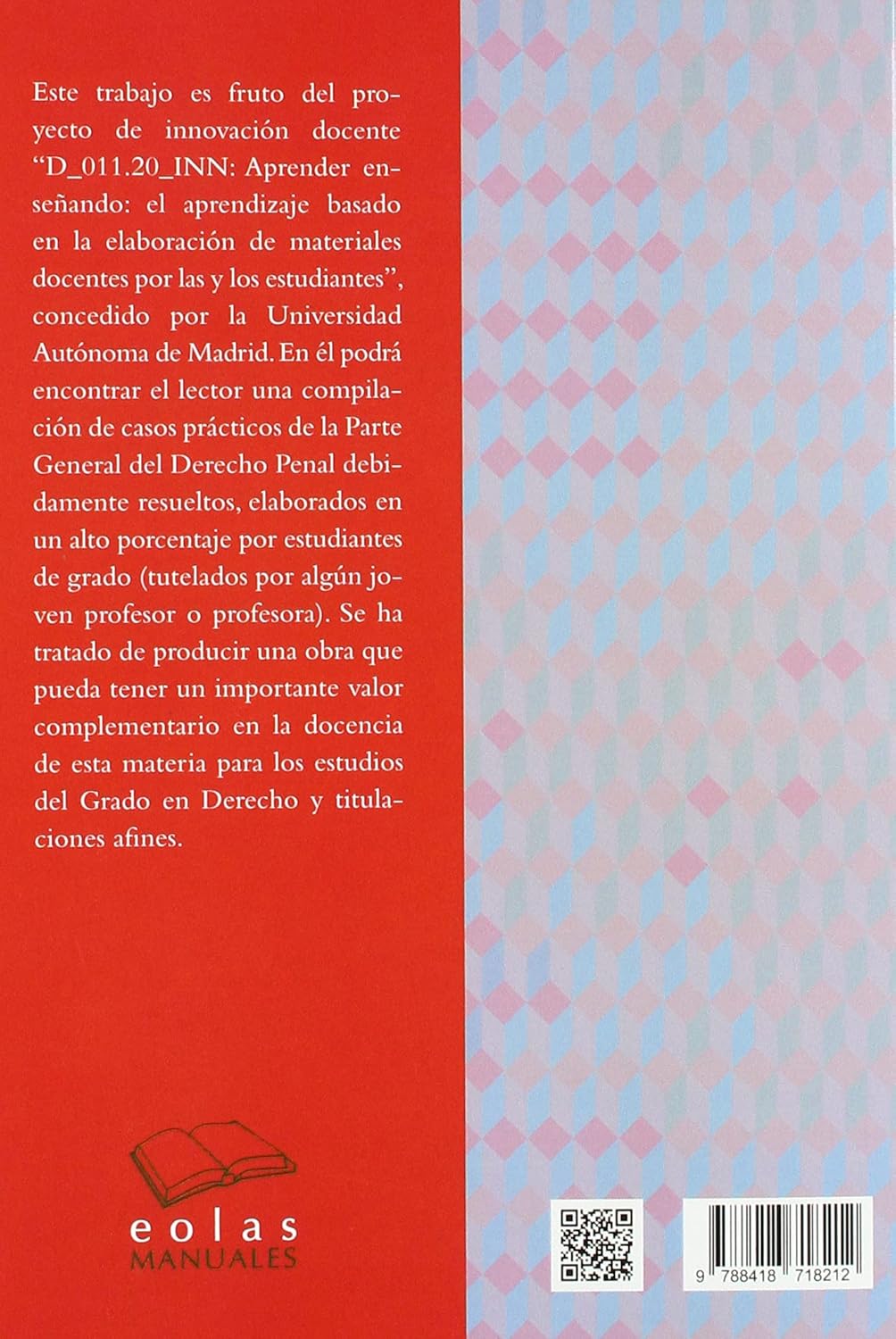 Este trabajo es fruto del pro¬yecto de innovación docente “D_011.20_INN: Aprender enseñando: el aprendizaje basado en la elaboración de materiales docentes por las y los estudiantes”, concedido por la Universidad Autónoma de Madrid. En él podrá encontrar el lector una compilación de casos prácticos de la Parte General del Derecho Penal debidamente resueltos, elaborados en un alto porcentaje por estudiantes de grado (tutelados por algún joven profesor o profesora). Se ha tratado de producir una obra que pueda tener un importante valor complementario en la docencia de esta materia para los estudios del Grado en Derecho y titulaciones afines.