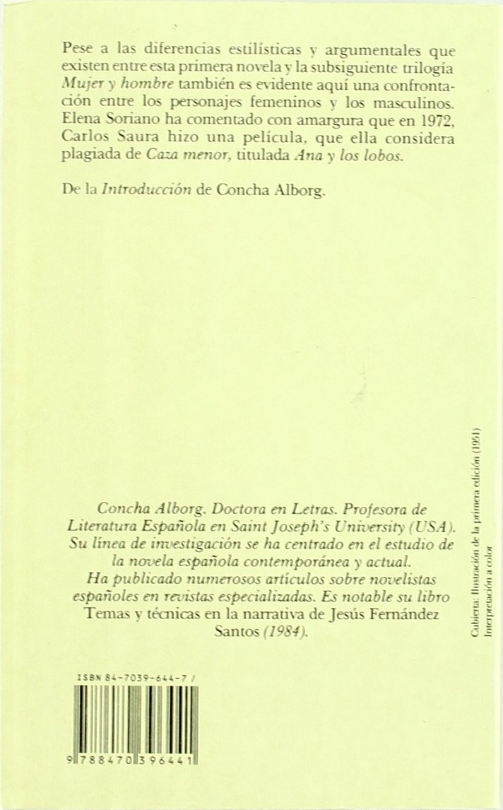 Pese a las diferencias estilísticas y argumentales que existen entre esta primera novela y la subsiguiente trilogía Mujer y hombre también es evidente aquí una confrontación entre los personajes femeninos y masculinos. Elena Soriano ha comentado con amargura que en 1972, Carlos Saura hizo una película, que ella considera plagiada de Caza menor, titulada Ana y los lobos.