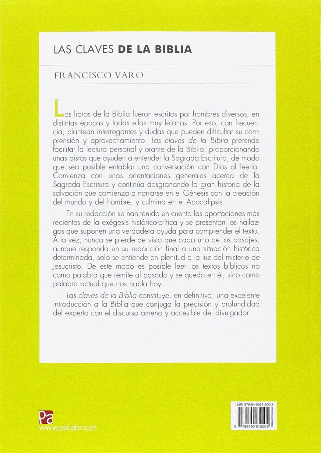 Una excelente introducción a la Biblia que conjuga la precisión y profundidad del experto con el discurso ameno y accesible del divulgador. Los libros de la Biblia fueron escritos por hombres diversos, en distintas épocas y todas ellas muy lejanas. Por eso, con frecuencia, plantean interrogantes y dudas que pueden dificultar su comprensión y aprovechamiento. Las claves de la Biblia pretende facilitar la lectura personal y orante de la Biblia, proporcionando unas pistas que ayuden a entender la Sagrada Escritura, de modo que sea posible entablar una conversación con Dios al leerla. Comienza con unas orientaciones generales acerca de la Sagrada Escritura y continúa desgranando la gran historia de la salvación que comienza a narrarse en el Génesis con la creación del mundo y del hombre, y culmina en el Apocalipsis. En su redacción se han tenido en cuenta las aportaciones más recientes de la exégesis histórico-crítica y se presentan los hallazgos que suponen una verdadera ayuda para comprender el texto. A la vez, nunca se pierde de vista que cada uno de los pasajes, aunque responda en su redacción final a una situación histórica determinada solo se entiende en plenitud a la luz del misterio de Jesucristo. De este modo es posible leer los textos bíblicos no como palabra que remite al pasado y se queda en él, sino como palabra actual que nos habla hoy. Las claves de la Biblia constituye, en definitiva, una excelente introducción a la Biblia que conjuga la precisión y profundidad del experto con el discurso ameno y accesible del divulgador.