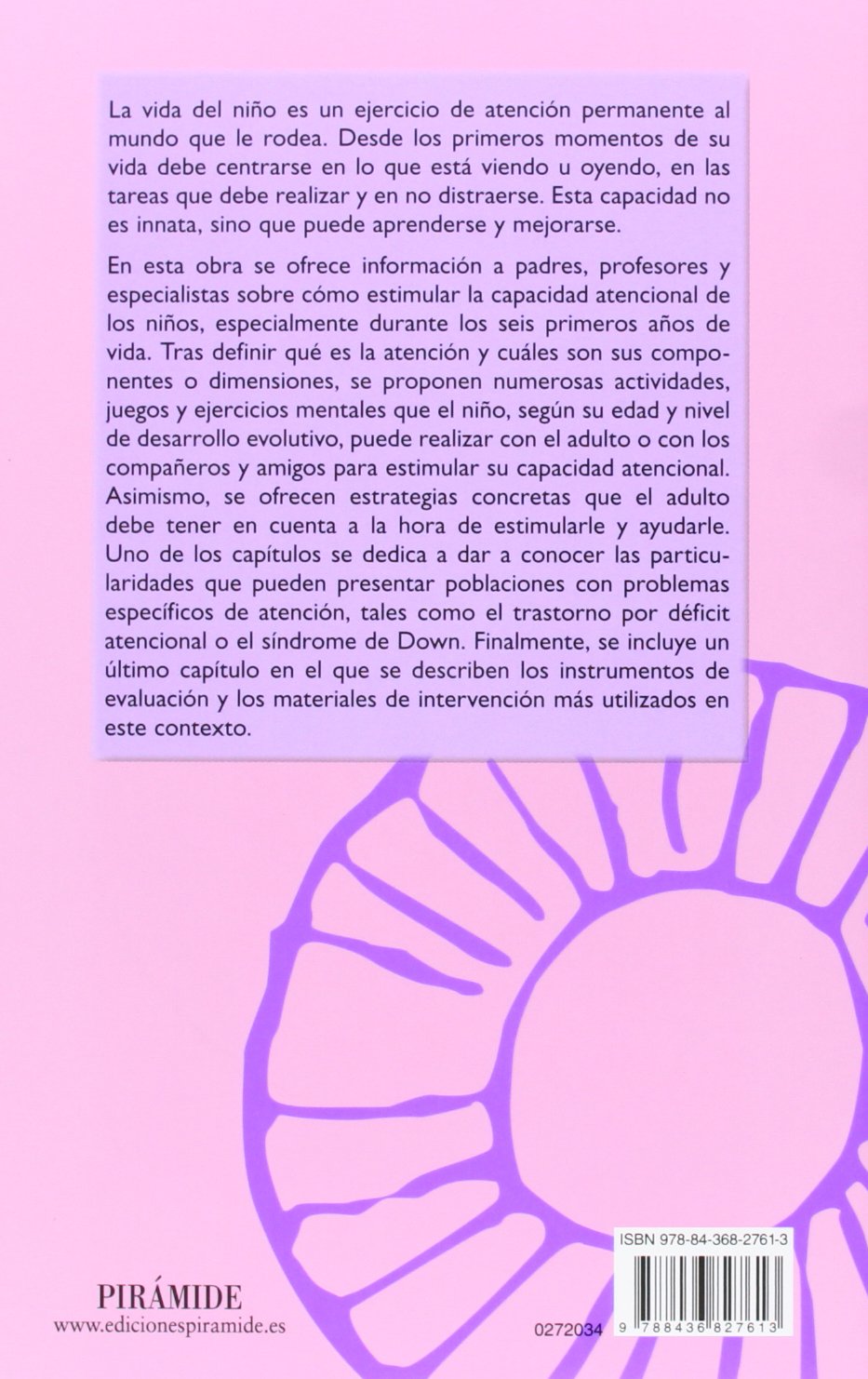 La vida del niño es un ejercicio de atención permanente al mundo que le rodea. Desde los primeros momentos de su vida debe centrarse en lo que está viendo u oyendo, en las tareas que debe realizar y en no distraerse. Esta capacidad no es innata, sino que puede aprenderse y mejorarse. En esta obra se ofrece información a padres, profesores y especialistas sobre cómo estimular la capacidad atencional de los niños, especialmente durante los seis primeros años de vida. Tras definir qué es la atención y cuáles son sus componentes o dimensiones, se proponen numerosas actividades, juegos y ejercicios mentales que el niño, según su edad y nivel de desarrollo evolutivo, puede realizar con el adulto o con los compañeros y amigos para estimular su capacidad atencional. Asimismo, se ofrecen estrategias concretas que el adulto debe tener en cuenta a la hora de estimularle y ayudarle. Uno de los capítulos se dedica a dar a conocer las particularidades que pueden presentar poblaciones con problemas específicos de atención, tales como el trastorno por déficit atencional o el síndrome de Down. Finalmente, se incluye un último capítulo en el que se describen los instrumentos de evaluación y los materiales de intervención más utilizados en este contexto.