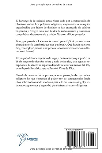 El hartazgo de la sociedad actual viene dado por la persecución de objetivos vacíos. Los políticos, religiosos, empresarios o cualquier organización con ánimo de dominio se han encargado de cultivar crispación y recoger furia, con la idea de radicalizarnos y dividirnos con palabras de pertenencia y miedo. Mataron al libre pensador. Pero ¿qué pasaría si les arrancásemos el poder? ¿Si de pronto todos alcanzásemos la zanahoria que nos pusieron? ¿Qué harían nuestros dirigentes? ¿Qué pasaría si de pronto todos tuviésemos varios millones en el banco? En un país del sur etiquetado de vago y fiestero fue lo que pasó. Un 18 de mayo todo rico fue pobre y todo pobre rico, con algunas excepciones. El dinero se repartió dejando de estar en manos del 1% , un milagro informático que se llamó el Virus de Dios. Cuando la mente no tiene preocupaciones piensa, hecho que saben peligroso los que sustentan el poder por las consecuencias hacia ellos, sobre todo cuando a todo un país se le cae la venda de golpe reuniendo argumentos y seguridad para enfrentarse a sus dirigentes.
