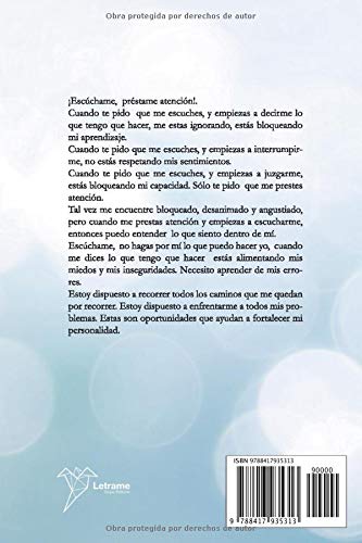 ¡Escúchame!Cuando te pido que me escuches y tú empiezas a aconsejarme, no estás haciendo lo que te pido, estás bloqueando mi aprendizaje.Cuando te pido que me escuches y tú empiezas a interrumpirme, no estás respetando mis sentimientos.Cuando te pido que me escuches y tú empiezas a juzgarme, estás bloqueando mi capacidad.Escúchame, por favor, todo lo que te pido es que me escuches, solo eso, escúchame.Tal vez me encuentre desanimado y angustiado, pero cuando me escuchas y comprendes lo que siento, por muy irracional que sea, es que puedo empezar a darme cuenta de lo que hay dentro de mí.Pero cuando tú haces por mí lo que puedo hacer yo estás alimentando mis miedos y mis inseguridades. Estoy dispuesto a recorrer todos los caminos que me quedan por recorrer. Estoy dispuesto a enfrentarme a todos mis problemas, ya que estas son oportunidades que ayudan a fortalecer mi personalidad.Julia Baldeón