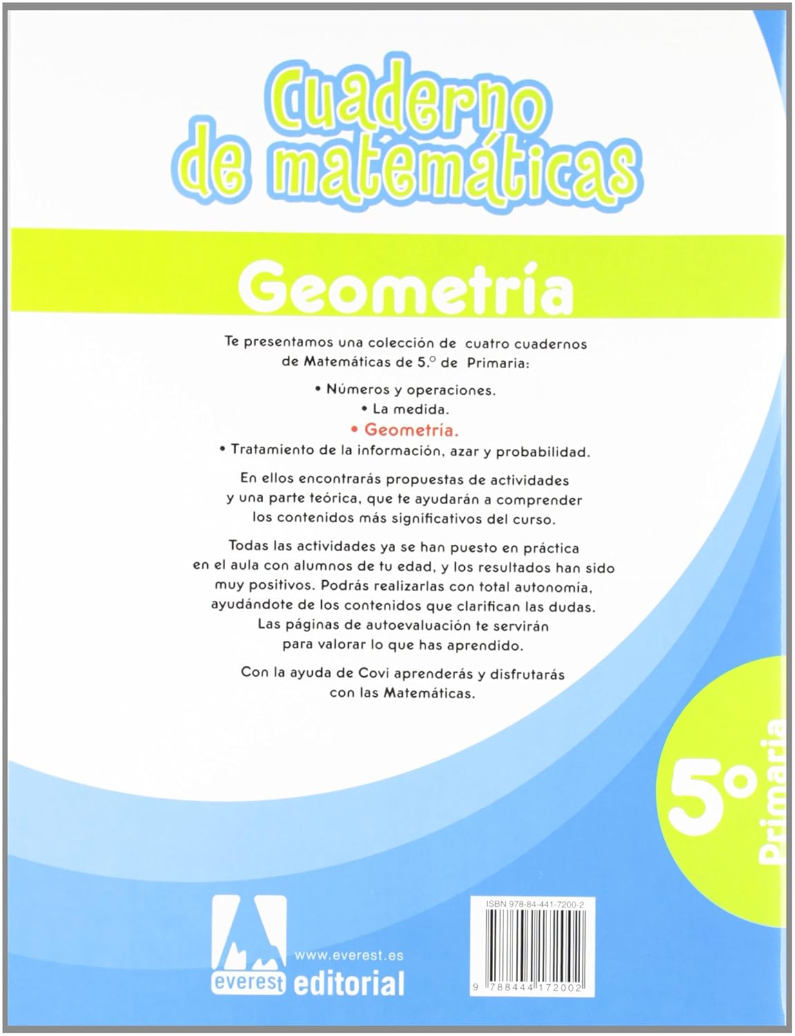 Te presentamos una colección de cuatro cuadernos de Matemáticas de 5º de Primaria. -Números y Operaciones. -La Medida. -Geometría. -Tratamiento de la información, azar y probabilidad. En ellos encontrarás propuestas de actividades y una parte teórica, que te ayudarán a comprender los contenidos más significativos del curso. Todas las actividades ya se han puesto en práctica en el aula con alumnos de tu edad, y los resultados han sido muy positivos. Podrás realizarlas con total autonomía, ayudándote de los contenidos que clarifican las dudas. Las páginas de autoevaluación te servirán para valorar lo que has aprendido. Con la ayuda de Covi aprenderás y disfrutarás con las Matemáticas.