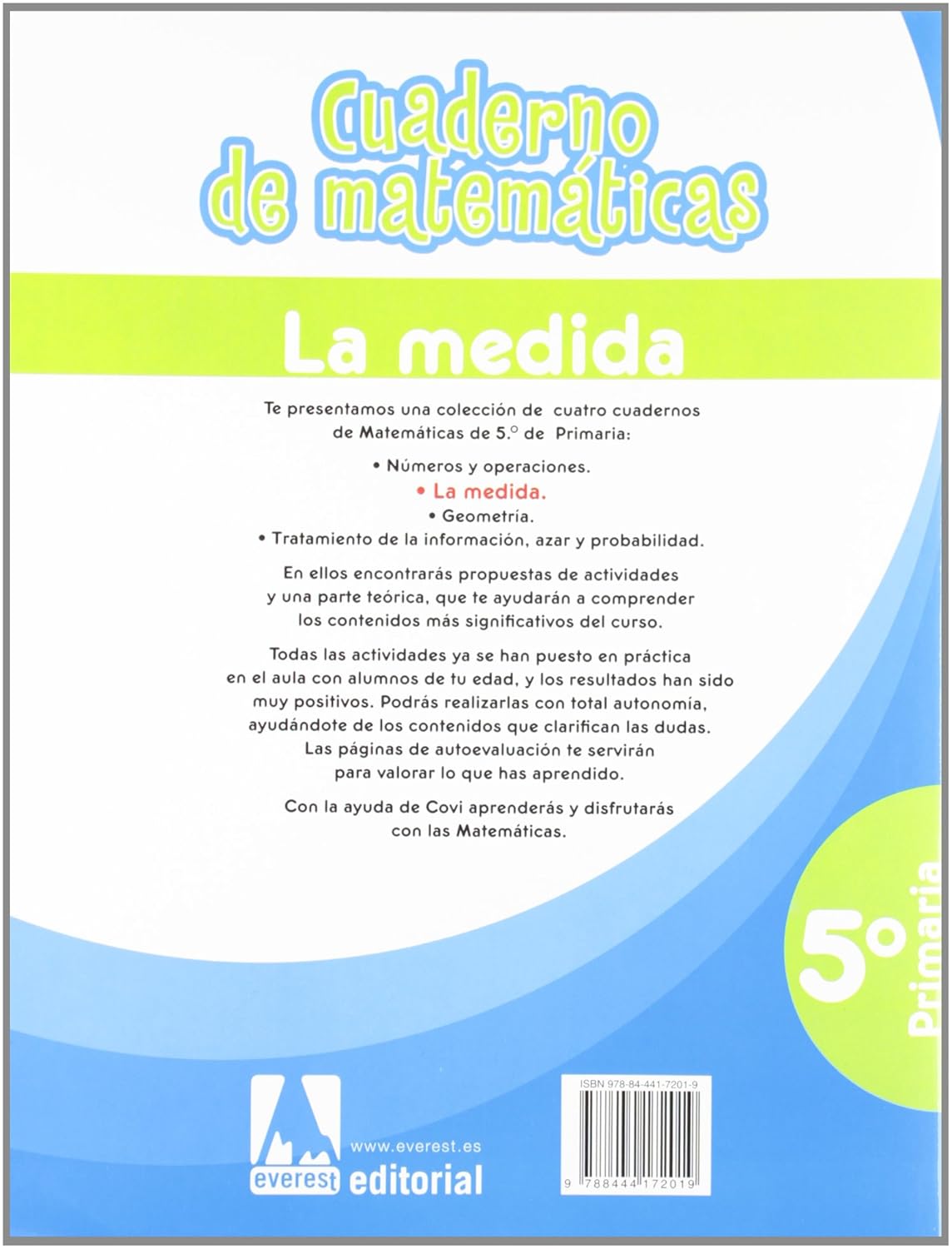 Te presentamos una colección de cuatro cuadernos de Matemáticas de 5º de Primaria. -Números y Operaciones. -La Medida. -Geometría. -Tratamiento de la información, azar y probabilidad. En ellos encontrarás propuestas de actividades y una parte teórica, que te ayudarán a comprender los contenidos más significativos del curso. Todas las actividades ya se han puesto en práctica en el aula con alumnos de tu edad, y los resultados han sido muy positivos. Podrás realizarlas con total autonomía, ayudándote de los contenidos que clarifican las dudas. Las páginas de autoevaluación te servirán para valorar lo que has aprendido. Con la ayuda de Covi aprenderás y disfrutarás con las Matemáticas.